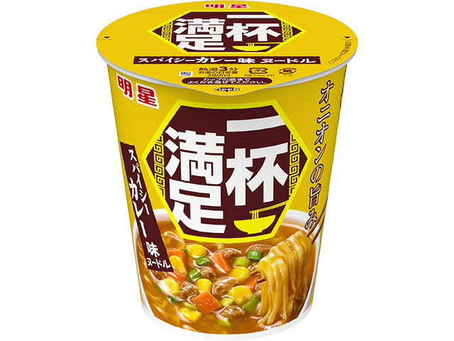 カップヌードルカレーのミニサイズ。 カレーが絡むコシのある太めんに、野菜の甘味のあるマイルドでとろみのあるカレースープ。 具材にはホクホクのポテト、肉、にんじん、ねぎが入ってます。 【原材料】油揚げめん(小麦粉,植物油脂,食塩,糖類,醤油,ポークエキス,チキンエキス,たん白加水分解物),スープ(豚脂,カレー粉,小麦粉,カレー調味料,玉ねぎ,でん粉,糖類,マーガリン,食塩,香味調味料,人参,魚介エキス,ピーナッツバター,香味油,香辛料),かやく(フライドポテト,味付豚ミンチ,玉ねぎ,人参,ねぎ),加工でん粉,調味料(アミノ酸等),カラメル色素,炭酸Ca,増粘多糖類,かんすい,乳化剤,香料,酸味料,酸化防止剤(ビタミンE),カロチノイド色素,香辛料抽出物,ビタミンB2,ビタミンB1【内容量】43g【賞味期限】別途商品ラベルに記載【保存方法】直射日光および高温多湿の場所を避けて保存【製造者】 日清食品合計税込¥3,980以上購入で送料無料! 送料無料 まとめてお得【12個販売】明星食品 一杯満足 スパイシーカレー味ヌードル 63g 2,260 ~