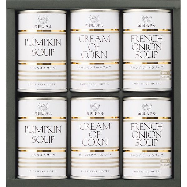 こちらの商品の包装(ラッピング)について○ラッピング・のし承ります(有料)。 のし名入れはご注文時備考欄にご記載下さい。 注文者名とお届け先名が異なる場合は「(注文者名)様ご依頼分」と送り状に記載して発送いたします。 帝国ホテルの味をご家庭へお届け!食材の旨味を最大限に引き出したこだわりのスープ3種類セットです。 【商品内容】●コーンのクリームスープ160g×2、フレンチオニオンスープ160g×2、パンプキンスープ160g×2(全て缶)【箱サイズ】19×20.9×6.4cm【箱入重量】1.4kg【宅配区分】常温【賞味期間】1,095日【アレルゲン】乳成分、小麦、牛肉、大豆、鶏肉、豚肉[ 缶詰 惣菜 セット 詰め合わせ ギフト ] 【ギフト】帝国ホテル スープ缶詰合せ(6缶) 【北海道・沖縄・離島配送不可】 5,226 ~