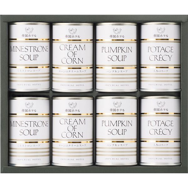 商品内容 ●コーンのクリームスープ160g×2、パンプキンスープ160g×2、ポタージュクレシー(人参のスープ)160g×2、ミネストロンスープ160g×2(全て缶)●賞味期間:製造より1095日●アレルギー:卵・乳成分・小麦●化粧箱入●箱サイズ:約24.4×20.5×6.4cm●箱重量:約1.8kg 帝国ホテルの味をご家庭へお届け!食材の旨味を最大限に引き出したこだわりのスープ4種類セットです。 商品内容・デザイン・価格等変更になる場合がございます。 ※北海道・沖縄・離島など一部お届けできない地域、また別料金を頂く地域もございます。 あらゆるギフトシーンにどうぞ内祝い お返し 出産 出産内祝い 結婚 結婚内祝い 御礼 快気祝い 快気内祝い 御見舞御礼 全快祝い お祝い 結婚式 引き出物 結婚祝い 結婚内祝い 引越しご挨拶 父の日 母の日 敬老の日 入学内祝い 入園内祝い 成人式 初節句 新築内祝い 粗品 記念品 二次会 景品 周年記念 コンペ景品 プレゼント 誕生日 お中元 残暑見舞い お歳暮 御年賀 贈答品 総合通販 一周忌 三回忌 法事引出物 香典返し 初盆 志 回忌法要 還暦御祝い 開店お祝い 退職 卒業記念品 お餞別 心ばかり 大量注文可 内祝 御返し 出産内祝 結婚内祝 お礼 快気祝 快気内祝 全快祝 御祝い 御祝 結婚式 引出物 結婚祝 御結婚お祝い 御結婚御祝 結婚御祝 結婚内祝 引越挨拶 引越御挨拶 挨拶 御挨拶 ごあいさつ ご挨拶 入学内祝 入園内祝 新築内祝 周年記念 ギフト 誕生日 中元 御中元 残暑見舞 残暑御見舞 歳暮 年賀 お年賀 法事 法要 法事引き出物 香典 還暦祝 還暦御祝 還暦お祝い 開店祝 開店御祝 開店御祝い 開店祝い 出産祝い 餞別 メッセージカード無料 寒中見舞い 送料無料 送料込※沖縄・離島除く 帝国ホテル スープ缶詰合せ (8缶) IHS-50 缶詰 惣菜 食品 ギフト 内祝い お祝い お返し 出産内祝い 結婚内祝い 香典返し お供え のし包装 メッセージカード無料 入学内祝い 退職 お礼 6,156 ~
