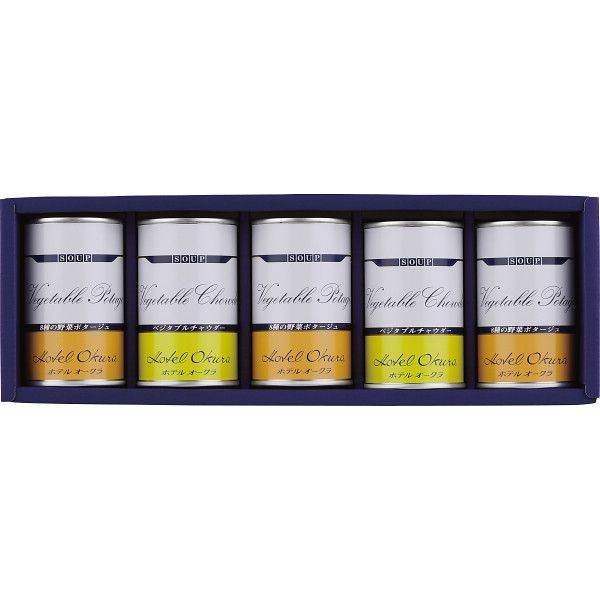 こちらの商品の包装(ラッピング)について○ラッピング・のし承ります(有料)。 のし名入れはご注文時備考欄にご記載下さい。 注文者名とお届け先名が異なる場合は「(注文者名)様ご依頼分」と送り状に記載して発送いたします。 世界中の賓客をおもてなししてきたホテルオークラの味がお楽しみいただけます。 ホテルの味でありながら温めるだけのお手軽さが魅了のもらってうれしいギフトです。 【商品内容】●8種の野菜ポタージュ160g×3、ベジタブルチャウダー160g×2【箱サイズ】31.9×11.3×6.2cm【箱入重量】1.2kg【宅配区分】常温【賞味期間】1,080日【アレルゲン】卵、乳成分、小麦、大豆、鶏肉、豚肉[ 缶詰 惣菜 セット 詰め合わせ ギフト ] 【ギフト】ホテルオークラ スープ缶詰 詰合せ G-A 【北海道・沖縄・離島配送不可】 3,657 ~