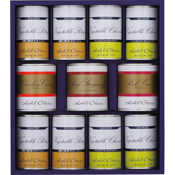 こちらの商品の包装(ラッピング)について○ラッピング・のし承ります(有料)。 のし名入れはご注文時備考欄にご記載下さい。 注文者名とお届け先名が異なる場合は「(注文者名)様ご依頼分」と送り状に記載して発送いたします。 世界中の賓客をおもてなししてきたホテルオークラの味がお楽しみいただけます。 ホテルの味でありながら温めるだけのお手軽さが魅了のもらってうれしいギフトです。 【商品内容】●ベジタブルチャウダー・8種の野菜ポタージュ各160g×各4、ビーフストロガノフ・ポークカレー・チキンカレー各190g×各1【箱サイズ】25.5×28.5×7.5cm【箱入重量】2.6kg【宅配区分】常温【賞味期間】1,080日【アレルゲン】卵、乳成分、小麦、牛肉、大豆、鶏肉、豚肉、りんご[ 缶詰 惣菜 セット 詰め合わせ ギフト ] 【ギフト】ホテルオークラ スープ・調理缶詰 詰合せ 【北海道・沖縄・離島配送不可】 12,193 ~