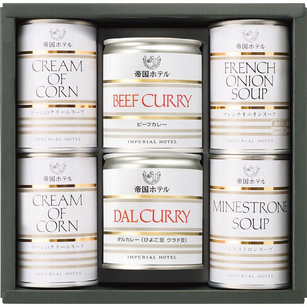こちらの商品の包装(ラッピング)について○ラッピング・のし承ります(有料)。 のし名入れはご注文時備考欄にご記載下さい。 注文者名とお届け先名が異なる場合は「(注文者名)様ご依頼分」と送り状に記載して発送いたします。 それぞれの野菜の特徴をいかして作り上げた帝国ホテルスープ3種と、スパイスの効いた具材の旨味引き立つ帝国ホテルカレー2種の缶詰ギフトです。 【商品内容】●コーンのクリームスープ160g×2、フレンチオニオンスープ160g×1、ミネストロンスープ160g×1、ビーフカレー190g×1、ダルカレー180g×1(全て缶)【箱サイズ】20.4×20.8×7.7cm【箱入重量】1.5kg【宅配区分】常温【賞味期間】1,080日【アレルゲン】卵、乳成分、小麦、牛肉、大豆、鶏肉、豚肉、りんご[ 缶詰 惣菜 セット 詰め合わせ ギフト ] 【ギフト】帝国ホテル スープカレー缶詰詰合せ(6缶) 【北海道・沖縄・離島配送不可】 6,531 ~
