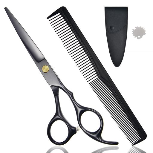 【切れ味抜群】高品質の4CRステンレス鋼製を採用し、真っ黒の塗装を加えます、質感すごく良い!他社の普通なステンレスハサミに比べて、より鋭い、更に腐食や錆を防ぐことができます。 高度の鍛造技術による濡れた髪をカットしても切れ味が落ちません、どんなに使っても切れ味が抜群長期間の使用に優れる耐久性を誇ります。 【自宅で簡単に使用可能】プロでも初心者でも使いやすい作りになっている散髪ハサミセット、子供の髪の毛を切ったり、自分をセルフしたり、足腰の悪いおじいちゃん、おばあちゃんを自宅で散髪できます、安価で便利で使えます、時間とお金を大節約! 【お好みに合う】人間工学に基づく最新型のすきばさみ、指のサイズに最適、自由自在にはさみをうまく使えます。 ネジ調節によって、刃の圧力に変化を与えることができます、個人の好みに合わせて気軽いに調整可能です。 【25%スキ率】鬢を直接削る櫛付き、急速で簡単で鬢を削られる。 すき率はあまりにも低すぎたり高すぎると不自然な髪型になる可能性があります、すきバサミは失敗しにくい25%スキ率は最適、ほどよく髪の毛がすけるのでものすごく使い勝手です。