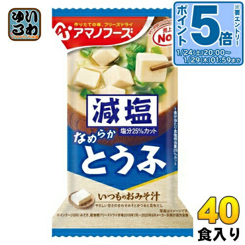 > こちらの商品の単品・まとめ買いはこちら【一個あたり 113円(税込)】【賞味期間】製造後360日【商品説明】なめらかなとうふの食感が楽しめる、やさしい味わいです。 当社「いつものおみそ汁 とうふ」と比べ、1食分当たり食塩相当量25%カット。 【名称および品名】即席みそ汁(乾燥タイプ)【エネルギー】1食(10.3g)あたり39kcal【栄養成分】たんぱく質 2.3g、脂質 0.9g、炭水化物 5.4g、食塩相当量 1.2g【原材料】豆腐(国内製造)、米みそ、ねぎ、調合みそ、デキストリン、風味調味料、乾燥わかめ、でん粉、かつお節粉末、酵母エキスパウダー、こんぶ粉末/調味料(アミノ酸等)、安定剤(加工デンプン)、凝固剤、酸化防止剤(ビタミンE)、酸味料、(一部にさば・大豆・魚醤(魚介類)を含む)【保存方法】常温【製造者、販売者、又は輸入者】アサヒグループ食品株式会社【アレルギー特定原材料】さば、大豆、魚介類※北海道・沖縄県・離島(一部)へのお届けは決済時に送料無料となっていても追加送料が必要です。 (コカ・コーラ直送を除く)北海道1個口 715円(税込)、沖縄県1個口 2420円(税込)※離島・一部地域は追加送料がかかる場合があります。 追加送料の詳細は注文確定メールにてご案内いたします。 ※本商品はご注文タイミングやご注文内容によっては、購入履歴からのご注文キャンセル、修正を受け付けることができない場合がございます。 変更・修正ができない場合は、メール、お電話にてご連絡をお願い致します。 ■ 法人・団体のお客様 大口購入のご相談承ります ■法人のお客様、各種団体のお客様で、まとまった数量でのご購入をご検討の際は、お気軽にご相談ください。 お客様のご要望に合わせて柔軟に対応させていただきます。 まずはお気軽にお問い合わせフォームよりご連絡ください。 送料無料 お味噌汁 FD インスタント 即席 味噌汁 手軽 簡単 便利 即席 汁もの 楽らく 美味しい インスタント味噌汁 即席味噌汁 乾燥味噌汁 おみそ汁 みそしる おみそしる 凍結乾燥 お湯 注ぐだけ 一人暮らし いつものお味噌汁 いつものみそ汁 いつもの味噌汁 天野実業 天野実業株式会社 塩分控えめ 塩分ひかえめ げんえん 塩分少なめ 豆腐 4971334208645 〔エントリーでポイント5倍!〕 アマノフーズ フリーズドライ 減塩いつものおみそ汁 とうふ 40食 (10食入×4 まとめ買い) お味噌汁 FD インスタント 即席 味噌汁 4,492 ~