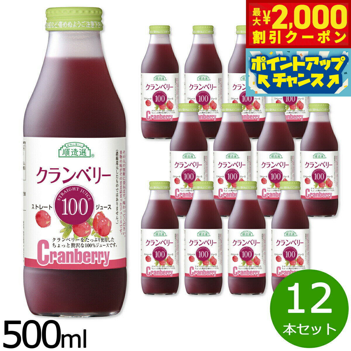 【最大2000円OFFクーポン!&店内ポイント最大54倍!本日限定!】順造選 クランベリー 500ml×12本セット ジュース ストレート 果汁50 無添加 無香料 瓶 日本製 粗搾り 果肉入り 【送料無料】 9,072 ~