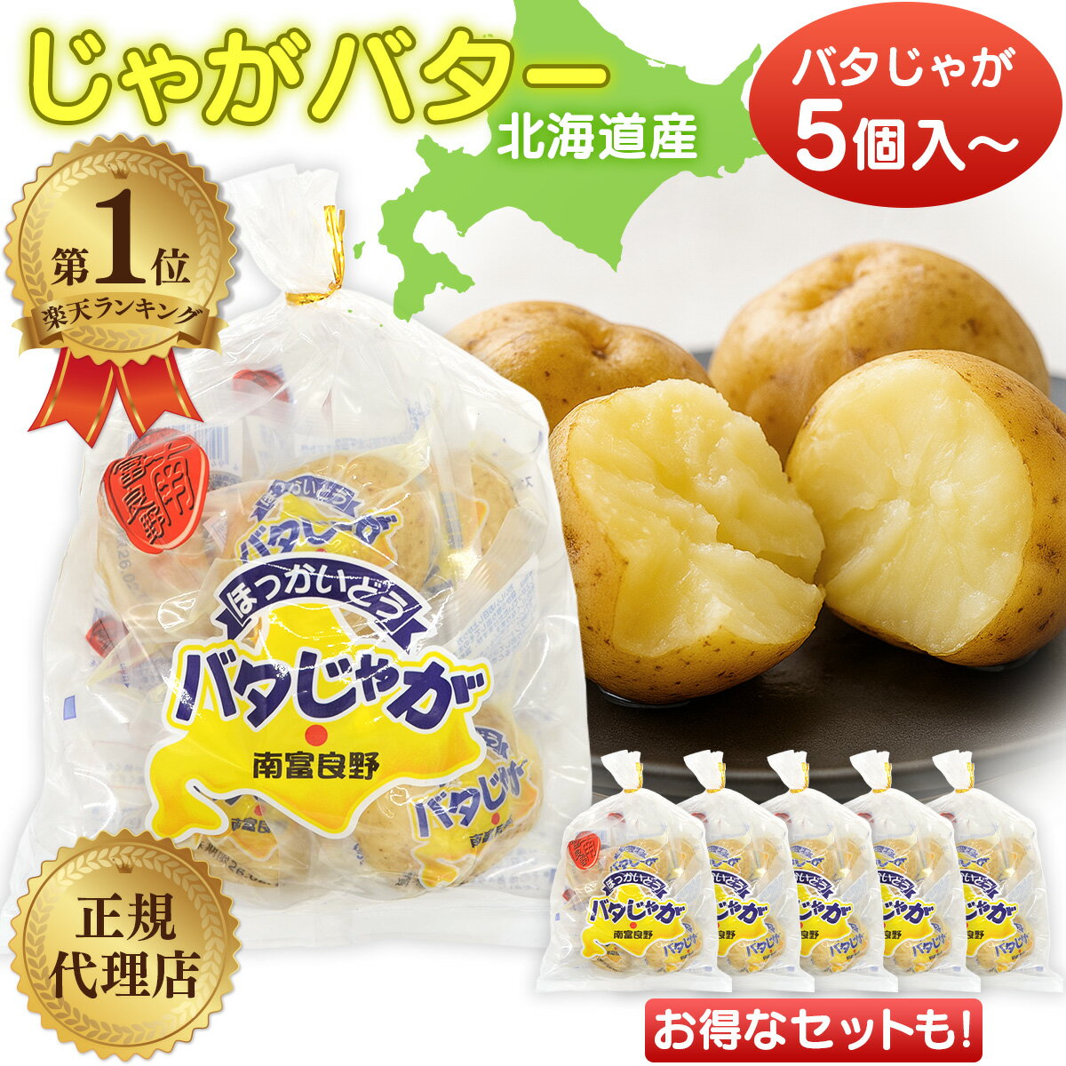 北海道産 じゃがバター バタじゃが 5個入 無添加 国産 真空パック 北海道男爵いも使用 道産バター 電子レンジで簡単調理 惣菜 ギフト おつまみ おやつ お土産 常温保存可能 1袋 2袋 3袋 6袋 10袋 南富良野町振興公社 まとめ買い 5個入 10個入 15個入 30個入 50個入 送料無料 北海道産男爵いもを丸ごと使用! 電子レンジで簡単調理! 北海道 南富良野産 じゃがバター バタじゃが 1袋 2袋 3袋 6袋 10袋 セット 添加物不使用 5個入 10個入 15個入 30個入 50個入 【北海道産男爵いもを丸ごと使用!】北の大地で育ったホクホク食感の男爵いもを厳選。 素材のうまみをそのまま真空パック。 【北海道産バターがとろけるコク!】北海道産の良質なバターを使用。 じゃがいもの甘みと絶妙にマッチする濃厚な風味。 【添加物不使用で安心安全!】原材料は「じゃがいも・バター・塩」のみ。 素材そのままの自然な味わいを楽しめます。 【電子レンジで簡単調理!】温めるだけで“できたてじゃがバター”の味。 おやつにも、おつまみにもぴったり。 【常温保存OK&個包装!】常温で保存できるから、ストックやアウトドアにも便利。 ギフトにも喜ばれる一品です。 北海道の広大な大地が育んだ「男爵いも」を、皮ごと丸ごと茹で上げて真空パック。 北海道産バターを贅沢に合わせた“究極のじゃがバター”です。 原材料はたったの3つ。 「男爵いも(北海道産)・バター・食塩」のみ。 添加物を一切使わず、自然のままのおいしさを閉じ込めました。 電子レンジで1?2分温めるだけで、ホクホクのバター香る「バタじゃが」が完成!忙しい日の一品料理やおつまみ、子どものおやつにもぴったりです。 アウトドア・キャンプ・BBQでも大活躍!常温で持ち運べて、火を使わずに温められるのでとっても便利。 シンプルな味付けなので、チーズをのせてグラタン風に、ベーコンを添えて洋風アレンジなど、アレンジ自在に楽しめます。 北海道の恵みと手作りのやさしさが詰まった「バタじゃが」を、ご家庭で、贈り物で、ぜひお楽しみください。 【おいしいお召し上がり方】本品は、袋から取り出してそのままでも召し上がっていただけますが、温めますと一層おいしくなります。 ●電子レンジで温めるときは、袋に数カ所穴を開け、1〜3分くらい温めます。 ●オーブントースターで温めるときは、袋から取り出して3分くらい温めます。 ●熱湯で温めるときは、袋のまま熱湯に入れ温めます。 【おいしいお召し上がり方】● くし刺し(焼きバタじゃが)バタじゃがに串を刺し、トースターなどで軽く焼いてお召し上がりください。 風味が引き立ちます。 ● ステーキの付け合わせに一口大にカットし、ステーキの付け合わせとしてご使用ください。 肉料理との相性が抜群です。 ● オードブルとしてそのまま、またはお好みのアレンジを加え、オードブルの一品としてご利用いただけます。 ● フライ調理バタじゃがを適度な大きさにカットし、軽く揚げると、外はカリッと中はホクホクの食感をお楽しみいただけます。 ● ちょい足しアレンジお好みでバターを追加したり、塩をひとふりすることで、より一層豊かな風味になります。 ● その他アレンジさまざまなお料理や調理法でお楽しみください。 商品名:北海道産 バタじゃが内容量:1玉(約90?110g)×5個入原材料:男爵いも(北海道産)、バター(北海道産)、食塩(一部に乳成分を含む)栄養成分(100gあたり):エネルギー:99kcal/たんぱく質:1.6g/脂質:1.1g/炭水化物:20.7g/食塩相当量:0.2g保存方法:直射日光を避けて常温で保存してください。 (冷凍不可)製造者:株式会社南富良野町振興公社 10 \楽天1位/ 北海道産 じゃがバター バタじゃが 5個入 無添加 国産 真空パック 北海道男爵いも使用 道産バター 惣菜 ギフト おつまみ おやつ お土産 常温保存可能 1袋 2袋 3袋 6袋 10袋 南富良野町振興公社 まとめ買い 5個入 10個入 15個入 30個入 50個入 送料無料 1,240 ~