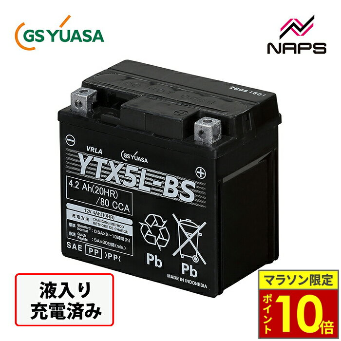 ABOUT NAPS -ナップスについて- 「For all Riders.」豊かなオートバイライフを過ごすために私たちは全力でサポートします。 ナップスは、1962年創業のオートバイ用品の小売・開発を行っています。 「ヒトのナップス」をコンセプトに、高い現場力と品揃えの豊富さを特徴とし、多様化するオートバイユーザーのニーズやファッションのトレンドを追い続けています。 【実店舗について】 国内、海外合わせて32拠点(アップガレージライダース6店舗含む)で展開する、日本最大級のオートバイ用品店です。 販売はもちろん、メンテナンス・サイズ調整・フィッティング等のアフターサービスも行っております。 神奈川県7店舗・東京都6店舗・埼玉県2店舗・群馬県2店舗宮城県1店舗・静岡県1店舗・愛知県4店舗・大阪府2店舗京都府1店舗・岡山県1店舗・広島県2店舗・愛媛県1店舗福岡県1店舗・台湾1店舗 製品のおすすめポイントGSユアサは、信頼性と高性能で知られるブランド。 二輪車用バッテリーにおいても、始動性・耐久性・メンテナンス性に優れ、ツーリングや日常使いを支える心強いパートナーです。 商品情報 商品名VRLA(制御弁式)バッテリー YTX5L-BS液入充電済みブランドGSユアサ品番90793-26135JAN4580181121245商品注意事項YTX4L-BSとYT4L-BSでは、サイズ・容量が同じですが、バッテリーの性能が異なっており、YTX4L-BSの方が高性能タイプで始動性能に優れています。 新車搭載がYTX4L-BSの車両にYT4L-BSを搭載されますと、早期エンジン始動不能やバッテリーの短寿命の原因となりますので、YTX4L-BSをご使用されますようお願い致します。 ※1 漏液性向上品、指定車種はYTZ7S(F)をご使用ください。 ※2 海外生産車両搭載YTZ10互換可能。 ※3 容量・始動性能が異なります。 ※4 アイドリングストップ車対応。 ※5 同サイズですが、始動性能が異なっているため、新車搭載がYTX4L-BSの車種については、YTX4L-BSをご使用ください。 ※6 Harley-Davidson用取付アダプター同梱。 ※7 新車搭載がGT4B-5の車種、傾斜搭載の場合にはGT4B-5をご使用ください。 ※8 傾斜搭載の場合にはGT7B-4をご使用ください。 ※9 傾斜搭載の場合にはGT12B-4をご使用ください。 ご使用時注意事項型式がGTで始まるものは急速充電はしないでください。 傾斜搭載されている車種については液入り充電済タイプ(メーカー充電品)をご使用ください。 VRLA(制御弁式)バッテリーにつきましては、必ず専用電解液ボトルをご使用ください。 TypeVRLA(制御弁式)液入り充電済み商品説明日本で開発された信頼と実績のある低自己放電と減液抑制性能を備えたシリーズ〇日本で開発、他VRLAシリーズのベースとなり、長年の実績を有する〇コンベンショナルシリーズよリも小型高容置化、高いメンテナンスフリ一性能を有するVRLAタイプ〇日本設計、日本製もラインアップに備えた高品質電池ジーエス・ユアサバッテリーの特長〈二輪バッテリーの特性を考え、長年培ってきた密閉型バッテリーのノウハウをベースに最適な設計を施した商品です。 〉◇安心のメンテナンスフリーバッテリー内部に発生するガスを、極板に吸収し、電解液に還元。 一般バッテリーのように電解液の減少がなく、液面点検、補水の必要がありません。 ◇優れたエンジン始動性能高性能特殊合金極板と、電気抵抗の低い微細マットセパレータにより、低温時や長期放置後も高いエンジン始動性が得られます。 ◇漏液を抑えた構造電解液を微細マットセパレータで保持しますので動きの激しいバイクでも電解液漏れの心配は、ほとんどありません。 ◇自己放電が少なく長期保管でも安心自己放電の少ない高性能カルシウム合金極板により、長期間の放置・保管後でも補充電が不要なエンジン始動能力を保ちます。 ◇高い信頼と品質ワールドスタンダードのジーエス・ユアサの技術力により高性能・高品質で安心してご使用になれます。 ◇タフネス放電状態での長期間放置後の回復不能なダメージを受けた時でも、補充電を行った際の回復性能を向上させた設計になっています。 12ヶ月または走行距離2万kmまでの製品補償付き \29日迄ポイント10倍/GSユアサ ジーエスユアサ YTX5L-BS VRLA(制御弁式)バッテリー メンテナンスフリー(MF) 液入充電済み 16,800 ~