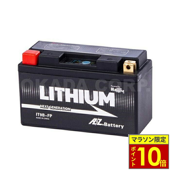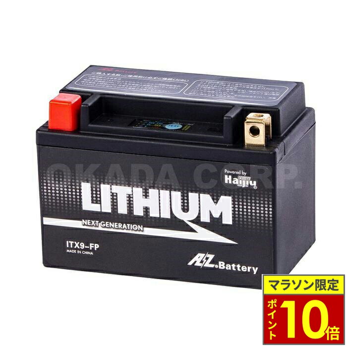 ABOUT NAPS -ナップスについて- 「For all Riders.」豊かなオートバイライフを過ごすために私たちは全力でサポートします。 ナップスは、1962年創業のオートバイ用品の小売・開発を行っています。 「ヒトのナップス」をコンセプトに、高い現場力と商品の品揃えの豊富さを特徴とし、多様化するオートバイユーザーのニーズやファッションのトレンドを追い続けています。 【実店舗について】 国内、海外合わせて32拠点(アップガレージライダース6店舗含む)で展開する、日本最大級のオートバイ用品店です。 販売はもちろん、メンテナンス・サイズ調整・フィッティング等のアフターサービスも行っております。 神奈川県7店舗・東京都6店舗・埼玉県2店舗・群馬県2店舗・宮城県1店舗・静岡県1店舗・愛知県4店舗・大阪府2店舗・京都府1店舗・岡山県1店舗・広島県2店舗・愛媛県1店舗・福岡県1店舗・台湾1店舗 【NAPSおすすめポイント】 鉛バッテリーの約1/3ほどの超軽量バッテリーです。 鉛バッテリーに比べ、約1.5倍の始動性能『LiFePo4(リン酸鉄リチウムイオン)』を採用、コバルト系/マンガン系リチウムとは異なり、発火や爆発の恐れがあるガスを発生しないので安全です。 寿命も鉛バッテリーの約4倍。 【商品情報】 ■12ヶ月または2万km保証■充電電圧が13.5V以上、14.8V以下の車両に装着可能(エンジン回転数を2,000回転以上にて)■GPSナビゲーション、グリップヒーター等の電装パーツを装備している車両は充電が不十分になる場合がございます。 また、エンジンカスタム、その他改造している車両はバッテリー容量が不足する場合がございます。 ※画像はイメージです。 ※車名、排気量、車両型式、エンジン型式、年式が同一の場合でも、車種によってはマイナーチェンジ、特殊仕様車およびオプション設定車などで、搭載バッテリーが異なる場合があります。 必ず事前に実際に搭載されているバッテリー形式をご確認下さい。 【特徴】 バッテリーの状態がひと目でわかるLEDインジケーター付き。 他社リチウムイオンバッテリーにない、BMS(バッテリーマネージメントシステム)を内蔵しており、各セルの電圧のばらつき制御を行ない、バッテリー寿命を延ばします。 代表互換品番:○○X9-BS \29日迄ポイント10倍/AZ Battery AZ バッテリー ITX9-FP リチウムイオンバッテリー 33,124 ~