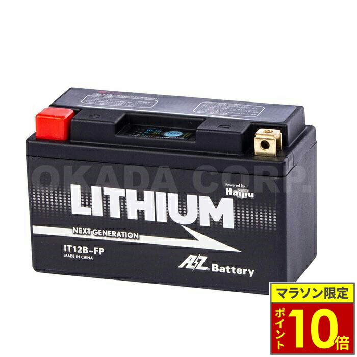 ABOUT NAPS -ナップスについて- 「For all Riders.」豊かなオートバイライフを過ごすために私たちは全力でサポートします。 ナップスは、1962年創業のオートバイ用品の小売・開発を行っています。 「ヒトのナップス」をコンセプトに、高い現場力と商品の品揃えの豊富さを特徴とし、多様化するオートバイユーザーのニーズやファッションのトレンドを追い続けています。 【実店舗について】 国内、海外合わせて32拠点(アップガレージライダース6店舗含む)で展開する、日本最大級のオートバイ用品店です。 販売はもちろん、メンテナンス・サイズ調整・フィッティング等のアフターサービスも行っております。 神奈川県7店舗・東京都6店舗・埼玉県2店舗・群馬県2店舗・宮城県1店舗・静岡県1店舗・愛知県4店舗・大阪府2店舗・京都府1店舗・岡山県1店舗・広島県2店舗・愛媛県1店舗・福岡県1店舗・台湾1店舗 【NAPSおすすめポイント】 鉛バッテリーの約1/3ほどの超軽量バッテリーです。 鉛バッテリーに比べ、約1.5倍の始動性能『LiFePo4(リン酸鉄リチウムイオン)』を採用、コバルト系/マンガン系リチウムとは異なり、発火や爆発の恐れがあるガスを発生しないので安全です。 寿命も鉛バッテリーの約4倍。 【商品情報】 ■12ヶ月または2万km保証■充電電圧が13.5V以上、14.8V以下の車両に装着可能(エンジン回転数を2,000回転以上にて)■GPSナビゲーション、グリップヒーター等の電装パーツを装備している車両は充電が不十分になる場合がございます。 また、エンジンカスタム、その他改造している車両はバッテリー容量が不足する場合がございます。 ※画像はイメージです。 ※車名、排気量、車両型式、エンジン型式、年式が同一の場合でも、車種によってはマイナーチェンジ、特殊仕様車およびオプション設定車などで、搭載バッテリーが異なる場合があります。 必ず事前に実際に搭載されているバッテリー形式をご確認下さい。 【特徴】 バッテリーの状態がひと目でわかるLEDインジケーター付き。 他社リチウムイオンバッテリーにない、BMS(バッテリーマネージメントシステム)を内蔵しており、各セルの電圧のばらつき制御を行ない、バッテリー寿命を延ばします。 代表互換品番:○○12B-4 \29日迄ポイント10倍/AZ Battery AZ バッテリー IT12B-FP リチウムイオンバッテリー 33,124 ~