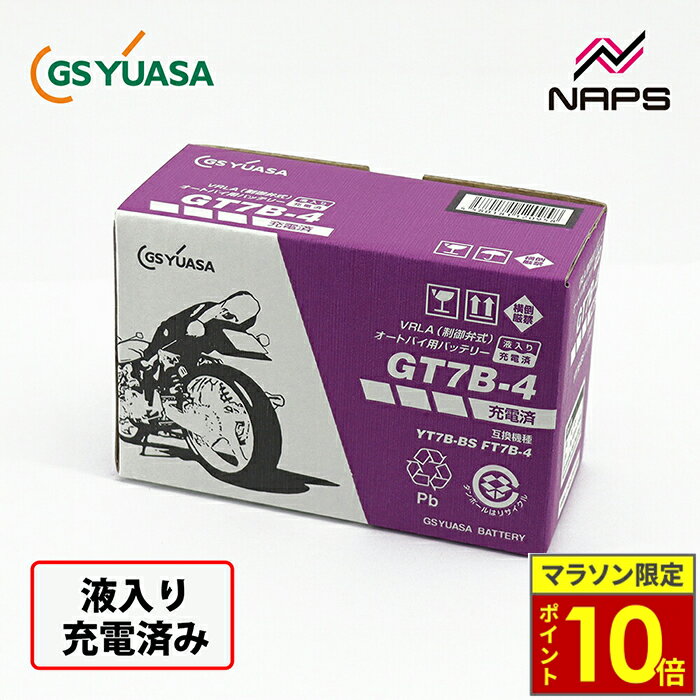 ABOUT NAPS -ナップスについて- 「For all Riders.」豊かなオートバイライフを過ごすために私たちは全力でサポートします。 ナップスは、1962年創業のオートバイ用品の小売・開発を行っています。 「ヒトのナップス」をコンセプトに、高い現場力と品揃えの豊富さを特徴とし、多様化するオートバイユーザーのニーズやファッションのトレンドを追い続けています。 【実店舗について】 国内、海外合わせて32拠点(アップガレージライダース6店舗含む)で展開する、日本最大級のオートバイ用品店です。 販売はもちろん、メンテナンス・サイズ調整・フィッティング等のアフターサービスも行っております。 神奈川県7店舗・東京都6店舗・埼玉県2店舗・群馬県2店舗宮城県1店舗・静岡県1店舗・愛知県4店舗・大阪府2店舗京都府1店舗・岡山県1店舗・広島県2店舗・愛媛県1店舗福岡県1店舗・台湾1店舗 製品のおすすめポイントGSユアサは、信頼性と高性能で知られるブランド。 二輪車用バッテリーにおいても、始動性・耐久性・メンテナンス性に優れ、ツーリングや日常使いを支える心強いパートナーです。 商品情報 商品名VRLA(制御弁式)バッテリー GT7B-4液入充電済みブランドGSユアサ品番90793-26110JAN4580181120958商品注意事項YTX4L-BSとYT4L-BSでは、サイズ・容量が同じですが、バッテリーの性能が異なっており、YTX4L-BSの方が高性能タイプで始動性能に優れています。 新車搭載がYTX4L-BSの車両にYT4L-BSを搭載されますと、早期エンジン始動不能やバッテリーの短寿命の原因となりますので、YTX4L-BSをご使用されますようお願い致します。 ※1 漏液性向上品、指定車種はYTZ7S(F)をご使用ください。 ※2 海外生産車両搭載YTZ10互換可能。 ※3 容量・始動性能が異なります。 ※4 アイドリングストップ車対応。 ※5 同サイズですが、始動性能が異なっているため、新車搭載がYTX4L-BSの車種については、YTX4L-BSをご使用ください。 ※6 Harley-Davidson用取付アダプター同梱。 ※7 新車搭載がGT4B-5の車種、傾斜搭載の場合にはGT4B-5をご使用ください。 ※8 傾斜搭載の場合にはGT7B-4をご使用ください。 ※9 傾斜搭載の場合にはGT12B-4をご使用ください。 ご使用時注意事項型式がGTで始まるものは急速充電はしないでください。 傾斜搭載されている車種については液入り充電済タイプ(メーカー充電品)をご使用ください。 VRLA(制御弁式)バッテリーにつきましては、必ず専用電解液ボトルをご使用ください。 TypeVRLA(制御弁式)液入り充電済み商品説明新車メーカー要求に応えた小型、薄型サイズシリーズ〇搭載スペースの制約が大きい二輪車故の、小型薄型サイズを実現〇搭載位置の制約から、高い振動負荷にも耐えうる設計〇日本で開発された長年実績のあるシリーズジーエス・ユアサバッテリーの特長〈二輪バッテリーの特性を考え、長年培ってきた密閉型バッテリーのノウハウをベースに最適な設計を施した商品です。 〉◇安心のメンテナンスフリーバッテリー内部に発生するガスを、極板に吸収し、電解液に還元。 一般バッテリーのように電解液の減少がなく、液面点検、補水の必要がありません。 ◇優れたエンジン始動性能高性能特殊合金極板と、電気抵抗の低い微細マットセパレータにより、低温時や長期放置後も高いエンジン始動性が得られます。 ◇漏液を抑えた構造電解液を微細マットセパレータで保持しますので動きの激しいバイクでも電解液漏れの心配は、ほとんどありません。 ◇自己放電が少なく長期保管でも安心自己放電の少ない高性能カルシウム合金極板により、長期間の放置・保管後でも補充電が不要なエンジン始動能力を保ちます。 ◇高い信頼と品質ワールドスタンダードのジーエス・ユアサの技術力により高性能・高品質で安心してご使用になれます。 ◇タフネス放電状態での長期間放置後の回復不能なダメージを受けた時でも、補充電を行った際の回復性能を向上させた設計になっています。 12ヶ月または走行距離2万kmまでの製品補償付き \29日迄ポイント10倍/GSユアサ ジーエスユアサ GT7B-4 VRLA(制御弁式)バッテリー メンテナンスフリー(MF) 液入充電済み 28,800 ~
