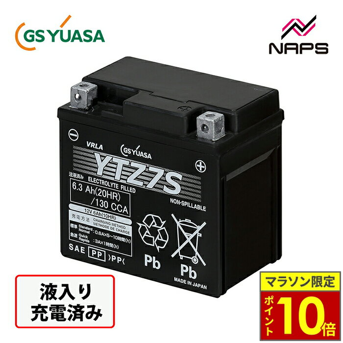 ABOUT NAPS -ナップスについて- 「For all Riders.」豊かなオートバイライフを過ごすために私たちは全力でサポートします。 ナップスは、1962年創業のオートバイ用品の小売・開発を行っています。 「ヒトのナップス」をコンセプトに、高い現場力と品揃えの豊富さを特徴とし、多様化するオートバイユーザーのニーズやファッションのトレンドを追い続けています。 【実店舗について】 国内、海外合わせて32拠点(アップガレージライダース6店舗含む)で展開する、日本最大級のオートバイ用品店です。 販売はもちろん、メンテナンス・サイズ調整・フィッティング等のアフターサービスも行っております。 神奈川県7店舗・東京都6店舗・埼玉県2店舗・群馬県2店舗宮城県1店舗・静岡県1店舗・愛知県4店舗・大阪府2店舗京都府1店舗・岡山県1店舗・広島県2店舗・愛媛県1店舗福岡県1店舗・台湾1店舗 製品のおすすめポイントGSユアサは、信頼性と高性能で知られるブランド。 二輪車用バッテリーにおいても、始動性・耐久性・メンテナンス性に優れ、ツーリングや日常使いを支える心強いパートナーです。 商品情報 商品名VRLA(制御弁式)バッテリー YTZ7S液入充電済みブランドGSユアサ品番90793-26111JAN4580181121085商品注意事項YTX4L-BSとYT4L-BSでは、サイズ・容量が同じですが、バッテリーの性能が異なっており、YTX4L-BSの方が高性能タイプで始動性能に優れています。 新車搭載がYTX4L-BSの車両にYT4L-BSを搭載されますと、早期エンジン始動不能やバッテリーの短寿命の原因となりますので、YTX4L-BSをご使用されますようお願い致します。 ※1 漏液性向上品、指定車種はYTZ7S(F)をご使用ください。 ※2 海外生産車両搭載YTZ10互換可能。 ※3 容量・始動性能が異なります。 ※4 アイドリングストップ車対応。 ※5 同サイズですが、始動性能が異なっているため、新車搭載がYTX4L-BSの車種については、YTX4L-BSをご使用ください。 ※6 Harley-Davidson用取付アダプター同梱。 ※7 新車搭載がGT4B-5の車種、傾斜搭載の場合にはGT4B-5をご使用ください。 ※8 傾斜搭載の場合にはGT7B-4をご使用ください。 ※9 傾斜搭載の場合にはGT12B-4をご使用ください。 ご使用時注意事項型式がGTで始まるものは急速充電はしないでください。 傾斜搭載されている車種については液入り充電済タイプ(メーカー充電品)をご使用ください。 VRLA(制御弁式)バッテリーにつきましては、必ず専用電解液ボトルをご使用ください。 TypeVRLA(制御弁式)液入り充電済み商品説明日本製の高品質、小型サイズ且つ高出力性能を備えたシリーズ〇薄型のエキスパンド極板を採用した高出力性能を実現〇ターミナル構造(サイドブッシング方式)で小型サイズ且つ、高出力〇日本製だからできる職人レベルの徹底した管理で高品質を実現ジーエス・ユアサバッテリーの特長〈二輪バッテリーの特性を考え、長年培ってきた密閉型バッテリーのノウハウをベースに最適な設計を施した商品です。 〉◇安心のメンテナンスフリーバッテリー内部に発生するガスを、極板に吸収し、電解液に還元。 一般バッテリーのように電解液の減少がなく、液面点検、補水の必要がありません。 ◇優れたエンジン始動性能高性能特殊合金極板と、電気抵抗の低い微細マットセパレータにより、低温時や長期放置後も高いエンジン始動性が得られます。 ◇漏液を抑えた構造電解液を微細マットセパレータで保持しますので動きの激しいバイクでも電解液漏れの心配は、ほとんどありません。 ◇自己放電が少なく長期保管でも安心自己放電の少ない高性能カルシウム合金極板により、長期間の放置・保管後でも補充電が不要なエンジン始動能力を保ちます。 ◇高い信頼と品質ワールドスタンダードのジーエス・ユアサの技術力により高性能・高品質で安心してご使用になれます。 ◇タフネス放電状態での長期間放置後の回復不能なダメージを受けた時でも、補充電を行った際の回復性能を向上させた設計になっています。 12ヶ月または走行距離2万kmまでの製品補償付き \29日迄ポイント10倍/GSユアサ ジーエスユアサ YTZ7S VRLA(制御弁式)バッテリー メンテナンスフリー(MF) 液入充電済み 19,800 ~