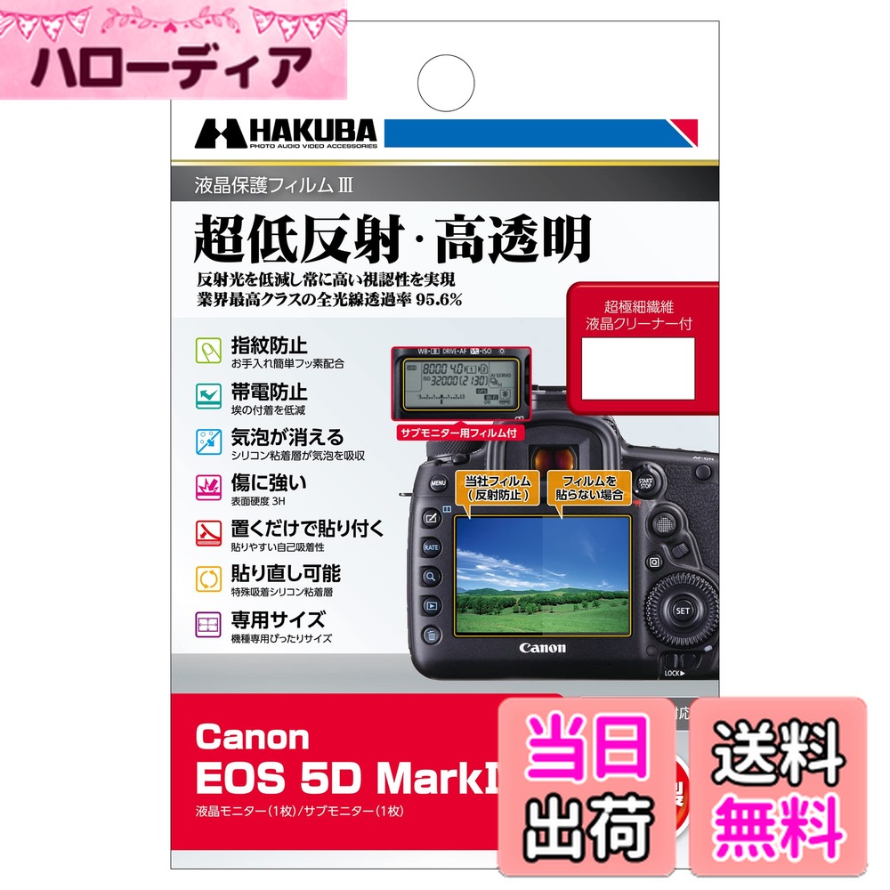 商品情報商品の説明反射光を低減し常に高い視認性を実現。 業界最高クラスの全光線透過率95.6%の透明度で、正確な色調と明暗の階調をストレートに映し出します。 【商品仕様】 ■梱包内容 : 液晶モニター用フィルム1枚 サブモニター用フィルム1枚 超極細繊維液晶クリーナー1枚 ■フィルムサイズ : 液晶モニター:70.0×47.9mm サブモニター:47.9×21.3mm ■材質 : フィルム:PET、シリコン膜 液晶クリーナー:不織布 ■対応機種 : Canon EOS 5D MarkIV ■備考 : サブモニター用フィルムには、液晶モニター用とは異なるフィルムを使用しています。 主な仕様 超低反射の液晶画面保護フィルム。 従来品より更に向上した全光線透過率は業界最高クラスの95.6%を実現。 信頼の日本国内製造。 撥水・防汚効果のある素材に更にフッ素コーティングを追加工。 より指紋が付きにくく、付いてしまっても簡単に拭き取ることが可能に。 ホコリやチリを寄せ付けない帯電防止性とキズに強いハード処理で液晶画面を美しい状態のままキープ。 置くだけで自然に貼りつき気泡も消える自己吸着性能を持ったシリコン粘着層。 失敗しても貼り直しOK。 機種専用ぴったりサイズ。 貼りやすさを考慮し画面より僅かに小さく設計しています。