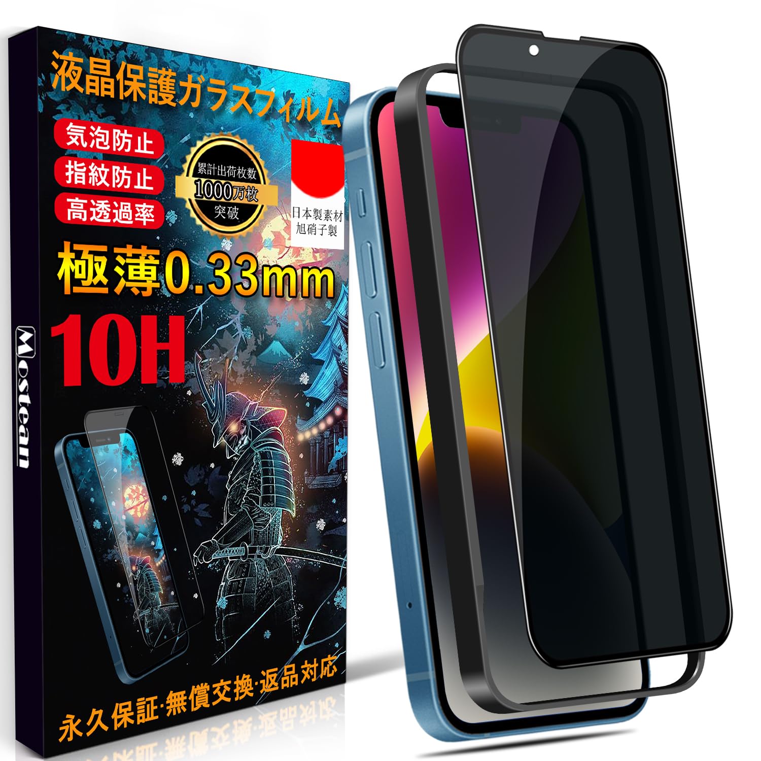 商品情報商品の説明『対応機種』 iPhone14/iphone 13/iphone 13 pro 6.1インチ対応 専用ガラスフィルム。 主な仕様 ※お読みください※「注意喚起」本製品はiPhone14/13/13Pro 対応ガラスフィルムです。 ご希望の数は在庫数上の場合はどうぞ弊店にてお問い合わせください。 【Mostean製品の概要】:永久について、製品に不具合が生じた場合は、お客様からのお問い合わせ内容に応じて代替品交換・返金対応を提供致します。 (お一人様につき1回限り)br【日本旭硝子素材・最強硬度10H・飛散防止】ガラスフィルム一般的な液晶保護フィルムの約6倍の強度。 衝撃は強化ガラスに吸収されますので、ディスプレイにかかる衝撃負荷を軽減し。 ディスプレイが破損することを防ぎます。 万が一の破損時も飛散防止加工によって破片はフィルムに張り付いた状態で破片がほとんど飛び散らない安全性の高いガラスになっています。 br【のぞき見防止】最新鋭の偏光フィルター採用で操作性をキープしながらのぞき見を防止します。 正面から見ると高透過率ではっきり見えますが、周りから見ると真っ黒で何も見られなくなり、満員電車やバスの中でもプライベートが守られて、ご安心ください!ご注意:のぞき見防止効果はiPhone画面の明るさによって変わります。 br【置くだけで装着!ガイド枠付き・保護ケースと干渉なし】専用の貼り付けガイド枠が同梱されています。 ガイド枠を利用することで、初心者でも簡単に貼り付けます。 また、自己吸着できるシリコン粘着シートで、簡単的に貼り付けます。 ガラスを液晶に置くだけで自然に吸着、簡単に気泡が抜いて行くので、誰でも簡単、綺麗に貼ることができます。 より一体感のある仕上がりを実現しました。 本体の縁にスペースを残すデザインを取っており、ほどよいサイズ感で、液晶画面を覆いながら、スマホケースと干渉せず併用できます。 br【快適なタッチ感!指紋防止?撥水撥油技術】真空蒸着技術を利用し、表面にナノコーティングを採用し、指紋防止薄膜を形成することで、滑らかであると同時にパワフルな耐油汚れ・汗染み・指紋性能を備え、汚れ防止効果はより長く持続でき、頻繁にスマホを拭く悩みがなくなります。