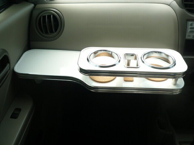 ★商品名 [フロントテーブル] MG33Sモコ(11/2〜)フロントテーブル ★商品詳細 MG33Sモコ(11/2〜)専用のフロントテーブル。 テーブルデザイン・ホルダーデザインともに車種別専用設計とし、洗練されたデザインが車内に高級感をプラスします。 弊社で開発、製造しております。 取り付け説明書付き。 ■仕様 ・ドリンクホルダー ×2 [500mlペットボトル対応] ・コルクコースター付 ■取り付けメモ:両面テープにて固定 ■ボックス開閉率 :100% ■カラーは3色からモール3種からお選びください。 ■画像はフルメッキモール、携帯ホルダー中央のオプション仕様商品です。 (税別プラス3,000円)■プラス2,000円(税別)にて携帯ホルダーを運転席側、中央、助手席側のいずれかにお付けできます。 ■プラス1,000円(税別)にて別注カラー22色をお選び頂けます。 ■プラス1,000円(税別)にてフルメッキモールにて製造致します。 ☆カラー、モールの選択で「その他」をご希望の場合は、こちらからお選びください。 ★適合車種等 ■モコ(11/2〜)DBA-MG33S ★送料に関して ■北海道は1,500円、沖縄、離島は2,500円でその他の地域は1,000円です(税別)。 ★その他備考 ■100%自社工場での製造です。 ■受注確定後、約3営業日にて出荷いたします。 ※ご購入前にご確認ください。 ※ 売り切り、お買い得商品など限定商品を除き、携帯ホルダー大小、ドリンクホルダー部の形は丸型、四角型の選択が可能です。 商品によっては、トレイの有無も選択可能です。 選択をご希望の場合は、所定の商品ページよりご選択をお願い致します。 ※ 取り付け後アッパーボックスやグローブボックスの使用ができなくなる場合がございます。 ※ 当製品を装着したことにより従来の機能が使用できない、または設置できない場合がございます。 ご確認は店舗までお問い合わせくださいませ。 ※ フィッティングについて車種により設置時に製品と車体側の設置個所の間に隙間が生じる場合がございます。 ※ 当製品のモールはタッカーで留めて固定している為モールに小さな穴が開いたようになり、穴は不良品ではございません。 予めご了承ください。 ※ 商品の写真や色など、お使いのモニターやディスプレイ、見る角度や光の反射等により実際の色とは若干異なる場合がございます。 予めご了承ください。
