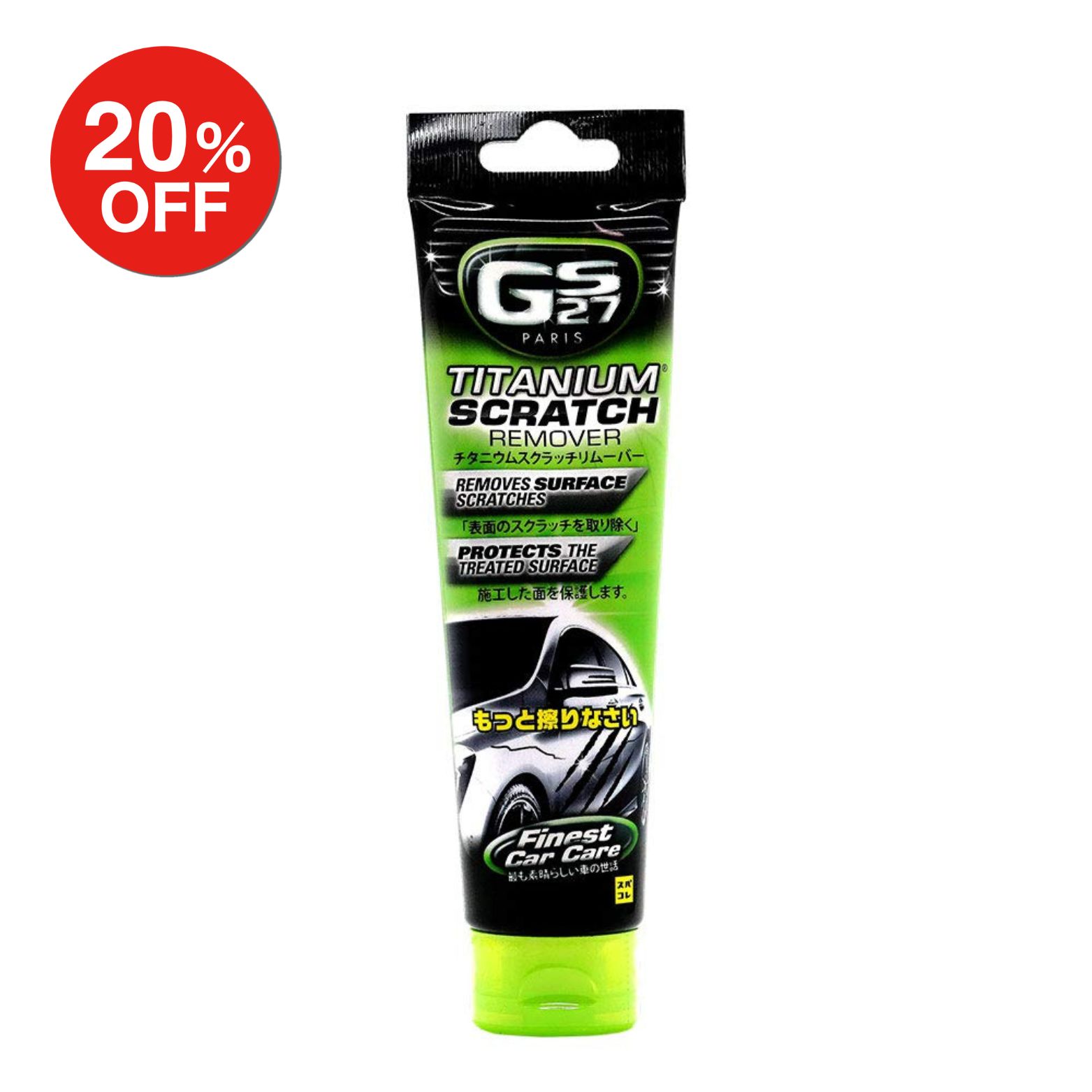 GS27 チタニウム スクラッチリムーバー ・特殊透明樹脂が小さな傷や塗装面の傷みに入り込み、見えにくく目立ちにくくする効果があります。 ・透明樹脂なので色を選ばず、どんな塗色でも使用が可能です。 ・クリア塗装だけでなくメッキパーツやプラスチックにも使用可能。 ・軽微な洗車傷程度であれば手磨きでの除去が可能。 ・手磨き用コンパウンドの代用としてもご使用頂けます。 【製品特徴】 「特殊透明樹脂」 特殊な透明樹脂が傷に入り込み傷を見えにくくする効果があります。 透明樹脂なので色を選ばず、どんな塗色でも使用が可能です。 「手磨きでの傷消しが可能」 本製品は特殊樹脂が微粒子コンパウンドの働きをする事で微細な傷であれば手磨きによって磨き落とすことが可能です。 一般的なコンパウンドを使用しての手磨きでは、傷の除去は可能なものの手磨きによる傷が目立ってしまい仕上がりに満足出来ない場合が多くありました。 本製品では同時に傷を埋める効果がある為、手磨きでも非常にきれいな仕上がりとなります。 深めの傷にはコンパウンドを使用した後、本製品で仕上げを行う事で様々な傷の手磨きによる仕上げを可能にしました。 「下地処理として使用可能」 軽微な水垢汚れやくすみなどの除去が可能です。 「塗装面以外での使用が可能」 ボディー表面だけでなく、プラスチック、メッキパーツ、ホイールなど様々な個所にご使用頂けます。 (必ず目立たない場所で試してからご使用下さい) ■これ一本あれば何かと役立つ、いざという時に活躍するアイテムです。 【使用方法】 1.洗車後の綺麗な状態で作業して下さい。 2.柔らかく清潔なタオルに少量取り、傷に塗り込むように塗り広げて下さい。 3.傷が目立たなくなるまで優しく擦って下さい。 4.タオルの綺麗な面で拭き取って完成です。 【注意事項】 〇本製品で除去、隠蔽が可能な傷は爪で引っかからない軽微な傷となります。 〇傷が深い場合はコンパウンドとの併用がオススメです。 〇傷がベースカラー、下地まで及んでいる場合には効果がありません。 〇使用の際はホコリや汚れが無い状態で使用して下さい。 風の強い日などはホコリを巻き込む可能性があります。 〇炎天下やボディーが熱い場合は使用しないで下さい。 〇成分の特性上、施工箇所が白く残る場合があります。 必ず使用前に目立たない場所で試してからご使用下さい。 〇塗装の劣化が酷い場合や再塗装されたお車には使用しないで下さい。 未塗装樹脂やゴム、レザーにはご使用頂けません。 〇使用の際は柔らかく清潔なタオルを使用して下さい。 固いタオルを使用すると傷が入る場合があります。 ▼▼▼ページを見た方にオススメのスパシャン製品▼▼▼GS27 チタニウム スクラッチリムーバー ・特殊透明樹脂が小さな傷や塗装面の傷みに入り込み、見えにくく目立ちにくくする効果があります。 ・透明樹脂なので色を選ばず、どんな塗色でも使用が可能です。 ・クリア塗装だけでなくメッキパーツやプラスチックにも使用可能。 ・軽微な洗車傷程度であれば手磨きでの除去が可能。 ・手磨き用コンパウンドの代用としてもご使用頂けます。 【製品特徴】 「特殊透明樹脂」 特殊な透明樹脂が傷に入り込み傷を見えにくくする効果があります。 透明樹脂なので色を選ばず、どんな塗色でも使用が可能です。 「手磨きでの傷消しが可能」 本製品は特殊樹脂が微粒子コンパウンドの働きをする事で微細な傷であれば手磨きによって磨き落とすことが可能です。 一般的なコンパウンドを使用しての手磨きでは、傷の除去は可能なものの手磨きによる傷が目立ってしまい仕上がりに満足出来ない場合が多くありました。 本製品では同時に傷を埋める効果がある為、手磨きでも非常にきれいな仕上がりとなります。 深めの傷にはコンパウンドを使用した後、本製品で仕上げを行う事で様々な傷の手磨きによる仕上げを可能にしました。 「下地処理として使用可能」 軽微な水垢汚れやくすみなどの除去が可能です。 「塗装面以外での使用が可能」 ボディー表面だけでなく、プラスチック、メッキパーツ、ホイールなど様々な個所にご使用頂けます。 (必ず目立たない場所で試してからご使用下さい) ■これ一本あれば何かと役立つ、いざという時に活躍するアイテムです。 【使用方法】 1.洗車後の綺麗な状態で作業して下さい。 2.柔らかく清潔なタオルに少量取り、傷に塗り込むように塗り広げて下さい。 3.傷が目立たなくなるまで優しく擦って下さい。 4.タオルの綺麗な面で拭き取って完成です。 【注意事項】 〇本製品で除去、隠蔽が可能な傷は爪で引っかからない軽微な傷となります。 〇傷が深い場合はコンパウンドとの併用がオススメです。 〇傷がベースカラー、下地まで及んでいる場合には効果がありません。 〇使用の際はホコリや汚れが無い状態で使用して下さい。 風の強い日などはホコリを巻き込む可能性があります。 〇炎天下やボディーが熱い