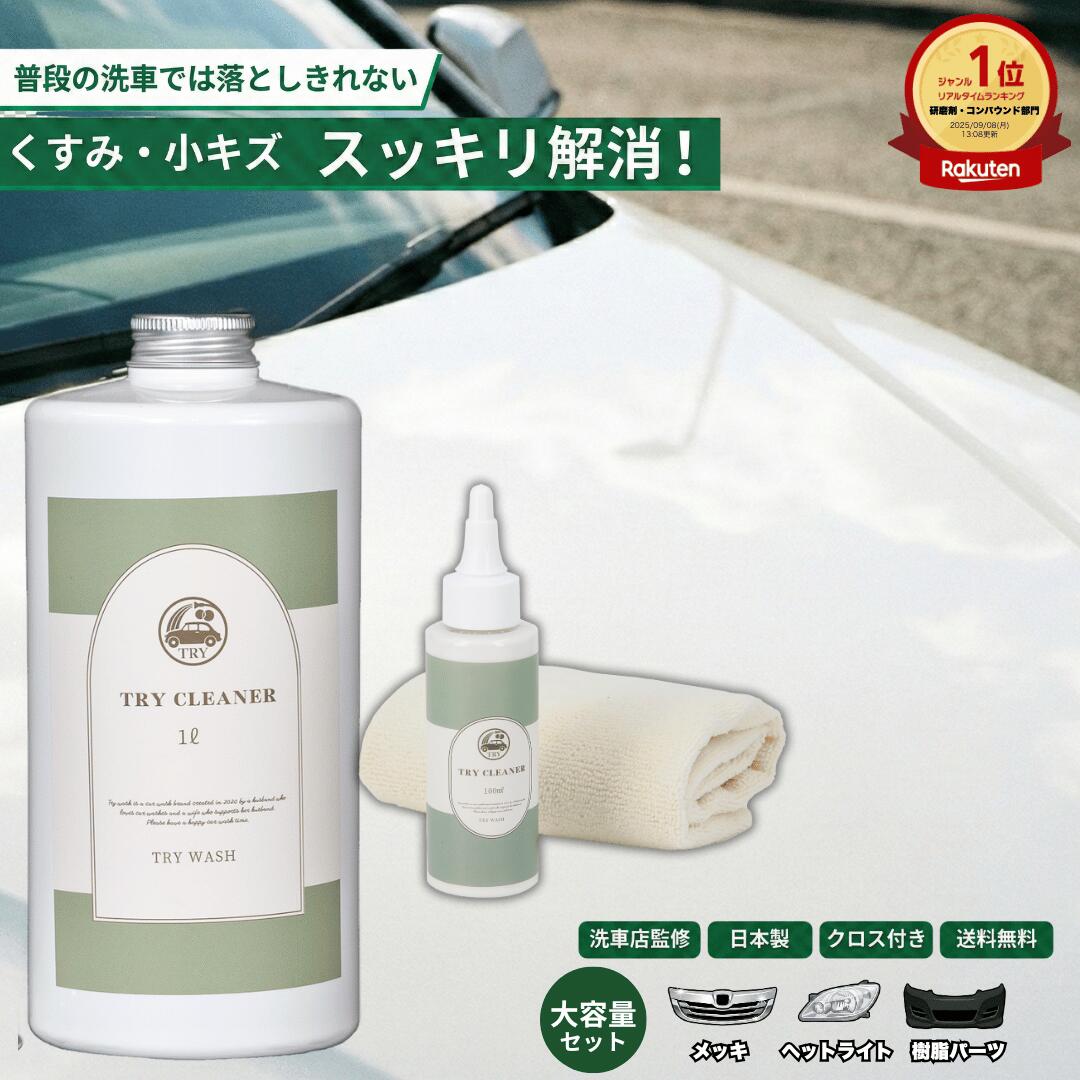 商品情報商品名TRY CLEANER 詰め替え大容量セット内容物TRY CLEANER 本体(1L 大容量ボトル)×1TRY CLEANER 小容量ボトル(100ml)×1詰め替え用漏斗(ロート)×1専用マイクロファイバークロス ×1使用方法洗車後、ボディの水分をしっかり拭き取るボトルをよく振り、付属のクロスに適量(直径5cm程度)取る50cm四方ずつ、力を入れずに縦横に優しく塗り広げる乾いたクロスでムラを拭き取り、艶のある状態に仕上げる※詰め替えは付属の漏斗を使用し、100mlボトルに衛生的に補充可能です注意事項レザー、ガラス面、ディスプレイ等には使用しないでください使用前に必ず目立たない場所でテスト施工を行ってください濃色車は柔らかいクロスを使用し、優しく作業してください他のコート剤との併用時は、相性や順番に注意してください使用中は換気を良くし、長時間肌に触れないようにしてください保管方法直射日光、高温(40℃以上)、凍結を避け、冷暗所に立てて保管してください夏場の車内など高温になる場所には絶対に保管しないでください使用後はキャップをしっかり閉めてください洗車 コンパウンド 研磨剤 傷消し 艶出し 水垢取り 撥水 下地処理 万能クリーナー|トライクリーナー 1L+100mlおまけ付き TRY WASH トライクリーナー|W成分配合|水垢・油膜・小キズを落とす外装クリーナー|撥水&艶出し|未塗装 5 【楽天ランキングNo.1★30日保証】コンパウンド 研磨剤 傷消し 艶出し 水垢取り 撥水 下地処理 万能クリーナー|トライクリーナー 1L+100mlおまけ付き TRY WASH 25,300 ~