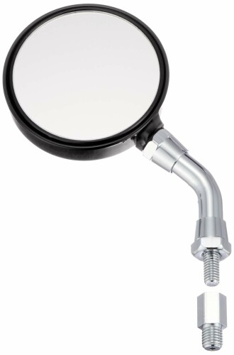 旧車テイストのレトロな雰囲気を放つ丸型ミラー。 耐震性と広角ミラーの組み合わせにより、視認性も確保しています。 鏡内部に亜鉛製の「おもり」を入れることで振動を軽減しミラーのブレを抑制。 直径12mmの極太ロッドを採用し、鏡の取付強度を高くすることで振動の多いバイクにも対応します。 一般的な純正ミラーが曲率R1200-1300に対し、R1000の鏡面を採用しているので、後方視界を広く確保できます。 ・新保安基準条件付適合(2007年以降の車両は別途緩衝装置の取り付けが必要)・タイプ:ハイ / クロームメッキ・サイズ:M10正ネジ・鏡面にレーザーマーキング入り・左右共通 片側1本入り※ 鏡面積は新保安基準に適合したサイズですが、衝撃緩衝装置が無いため、新保安基準適合外となります。 2007年以降のモデルは別途緩衝装置の取り付けが必要です。 ※ 本商品は、ワイドミラータイプとなっております。 遠近感が純正と異なります。 慣れるまで慎重に運転するように心がけてください。 ※ 適切な後方視界が確保できるようにミラーは左右に取り付け、かつ適正な位置に調整してください。 ※ この商品を取り付ける際にM10ボルトの締め付けトルクは車両毎の指定値にて締め付けてください。 ※ ミラーハウジング取り付け部分のミラーナットの締め付けトルクは15N・mです。