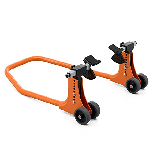 -/1個 (x 1)/29769・PatternName:フロントフォーク用・フロントフォークで支えるバイク用フロントススタンド・カウルに干渉やステム下に穴がないなど、一般的なフロントスタンドが使えない車両に最適・リフトアップ面はカウンターウエイト(重り)によって常に上を向く構造・高さ9段階調整 / 幅は無段階調整・耐荷重:200kgフロントフォーク下部から支えて持ち上げるタイプのフロントスタンド。 カウルに干渉したりステム下に穴がないなど、フロントスタンドが使えない車両に最適です。 リフトアップ面はカウンターウエイト(重り)によって常に上を向く構造なので簡単にリフトアップが可能。 フロントを持ち上げて行なう整備に便利です。 ※ フロントフォーク下部が平面で、左右対称である車両にご使用いただけます。