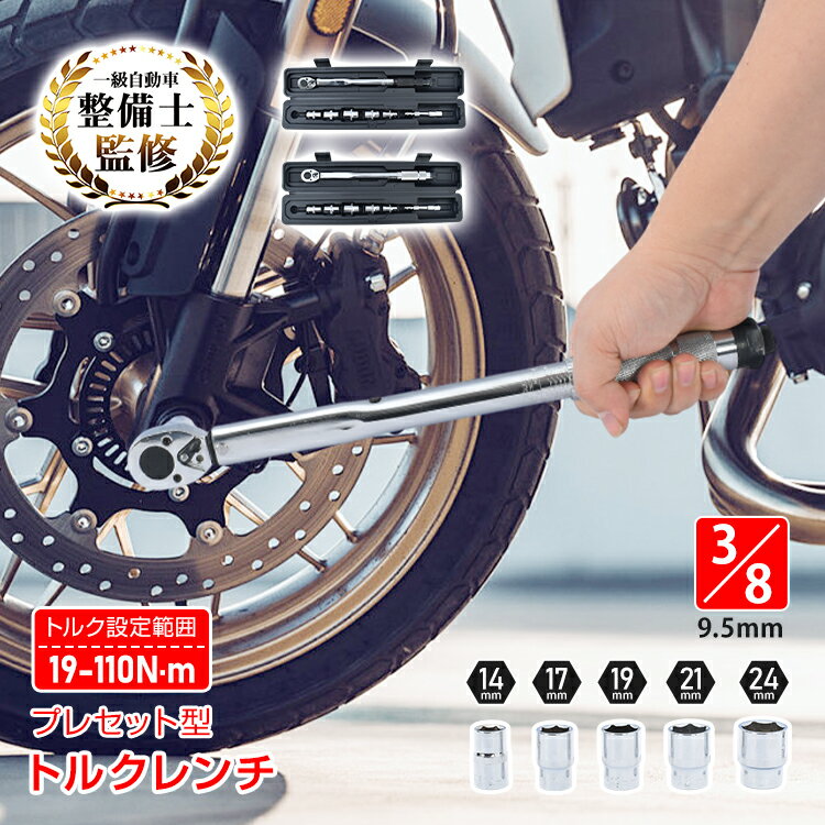 ■ プレセット型で規定トルクを正確に管理できるトルクレンチです。 ■ 19〜110N・mのトルク範囲でバイク・車の整備に対応します。 ■ N・m/KGSの2スケール表示と5N?m刻みで細かな設定が可能です。 ■ ロック機能付きグリップで設定後のトルクズレを防止します。 ■ 3/8インチ差し込み角でエンジン周りなど狭い箇所にも使いやすい設計です。 ■ 14・17・19・21・24mmのソケット5種と収納ケースが付属します。 【商品内容】:トルクレンチセット 【サイズ】:トルクレンチ約3.5×2.5×37.3cm/収納ケース約48.7×7.5×6.8cm 【重量】:約1.65kg(ケース含む) 【材質】:炭素鋼 【トルク設置範囲】:19-110N・m 【ソケット差込口】:3/8インチ 【精度】:±5% ○使用上の注意事項○ ※改造/本来の目的以外/強い衝撃などはお控え下さい。 ※仕様は改善の為に予告なく変更する場合があります。 ※ディスプレイ画面等の環境上、写真と実際の商品の色とは多少違う場合がございます。 ※海外輸入商品により、汚れ/ダメージ等がついている場合がございます。 ○以上を了承の上、ご購入ください○名称・内容 ・商品内容:トルクレンチセット 種類・サイズ ・サイズ:トルクレンチ3.5×2.5×37.3cm/収納ケース48.7×7.5×6.8cm 重量・耐久 ・重量:約1.65kg(ケース含む) その他 ・材質:炭素鋼 ・トルク設置範囲:19-110N・m ・ソケット差込口:3/8インチ ・精度:±5% 注意・説明 ※改造/本来の目的以外/強い衝撃などはお控え下さい。 ※仕様は改善の為に予告なく変更する場合があります。 ※ディスプレイ画面等の環境上、写真と実際の商品の色とは多少違う場合がございます。 ※海外輸入商品により、汚れ/ダメージ等がついている場合がございます。 ★以上、ご同意の上、ご購入ください! 【本日まで!5%オフCP】トルクレンチセット トルクレンチ プレセット型 3/8インチ 19-110N・m バイク 車 整備 工具 エンジン整備 ソケット5種 14mm 17mm 19mm 21mm 24mm 収納ケース Nm KGS ee466 3,850 ~