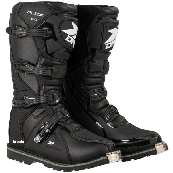 ディーエフジー DFG フレックス ブーツ オフロード 2.0カラー:ブラックサイズ:24.0cmオフロード初心者〜中級者に最適な、ブロックソール エンデューロブーツ。 ブーツ本体は操作性を損なわずに高い強度を確保し、障害物や転倒した際にしっかり足を保護する。 軽くて柔らかいため、これからオフロードを始める初心者でも使いやすい。 本格的なオフロードコースから林道ツーリングまで幅広く使用可能。 日本人の幅広・甲高な足の形状に合わせたジャパンフィット設計により、快適なフィット感を実現。 重量:約1500g(26.5/片足重量)ブーツ甲幅:ワイド設計(4E相当)ニーシンガード/ニーブレース対応素材:【甲部分】合成皮革・ポリウレタン(TPU)【 裏地】ポリエステル・スパンデックス【 ソール】合成樹脂(ラバー)【ご注意ください】・履き始めは、まだ生地が硬い状態のためブーツが硬く感じます。 安全性を確保するためにも、ブーツを柔らかくするために、必ず「ブーツの慣らし作業」を行ってください。 ・オフロードブーツはオンロードブーツと比べてつま先に厚みがあるため、バイクの車種によっては純正のシフトレバーの位置ではシフトチェンジ(シフトアップ)がやりづらい場合がございます。 その場合、シフトレバーの高さを1段階上げるなどの車体側の調整を行ってください。 ・オフロードコースや林道を走行する場合は、安全面からニーシンガードなどの膝や脛を守るプロテクターとセットで着用することを推奨いたします。 ・オフロードレーサーなどのキックペダルがある車両の場合、キックスタート時に過度に荷重をかけるとソールが破損する恐れがありますのでご注意ください。 ・ブーツの上から2番目のストラップの長さが合わない場合、上から2番目と3番目のストラップを付け替えることでストラップの長さ調整をすることが可能です。 ・ご使用になる前にブーツが安全な状態であることを確かめてご使用ください。 使用頻度によってはバックルのボルトが緩んでくる場合がございます。 ボルトが緩い場合はボルトの増し締めやネジロック剤などを使用してください。 A9945楽天 JP店 【メーカー在庫あり】 ディーエフジー DFG フレックス ブーツ オフロード 2.0 24.0cm 黒 A9945 JP店 26,659 ~