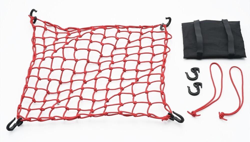 ■商品概要カラー:レッド【商品構成】・ネット本体×1個・フック×6個・サブコード×2本・ポーチ×1個■詳細説明使いやすいコンパクトなフック6個付。 変形や摩耗が少ない強化プラスチックを使用し、H型断面構造で強度のあるコンパクトフック。 コンパクトだから使い勝手も良く、ネットをたぐり、サイズ調整も可能な設計です。 小さなマス目&サブコード付。 約45mmのマス目で荷こぼれしにくく、実用性を考慮した4.0mmゴムで程よい伸び具合と締め付け具合。 マス目にむだの出ない、サブコード2本付。 収納時に便利なポーチ付。 ■注意点※画像は一部、他のカラーが含まれます。