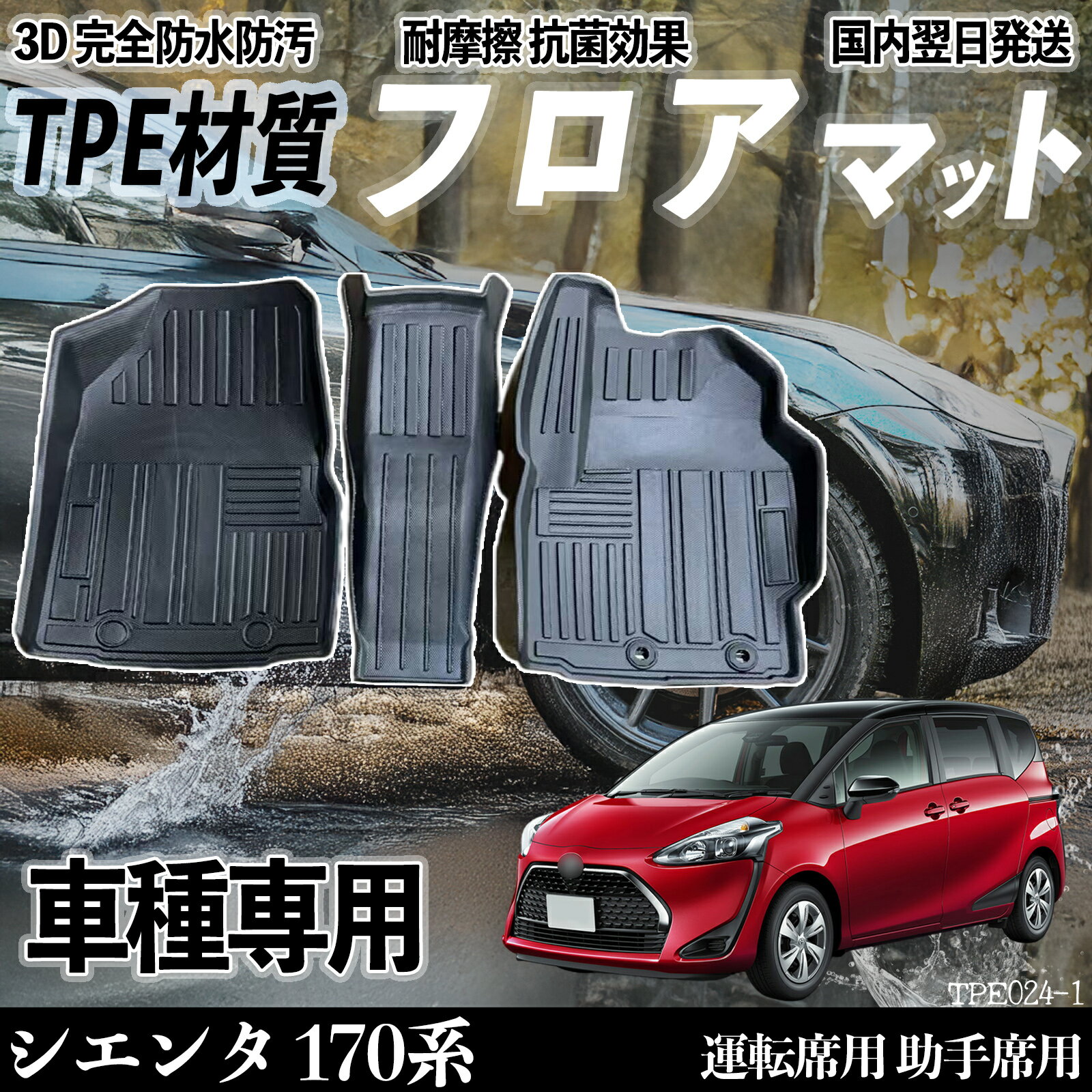 商品説明 適合車種 シエンタ 170系 NHP17型 NSP17型 NCP17型 H27.7-R4.8 セット内容追加式 運転席用×1 助手席用×1 2列目用×1 ラゲッジマット×1 商品の特徴 高品質TPE素材・オールシーズン対応 環境に優しい無臭TPE素材を使用。 耐摩耗・耐衝撃・耐熱性に優れ、夏も冬も変形しにくく、1年中快適。 お子様やペットがいても安心です。 3D立体構造・専用設計 車種専用3D設計で足元にぴったりフィット。 高いフチが泥・水を防ぎ、純正ストッパー対応でズレを防止します。 防水・滑り止め加工 滑り止め加工で走行中も安定。 防水性が高く、雨や雪の日も安心。 濡れ物や汚れから車内を守ります。 お手入れ簡単 汚れはサッと拭くだけ、水洗いも可能ですぐ乾く。 丈夫で長持ちします。 注意事項 ※ 【注意事項】この商品は5人乗り専用。 ご購入前に、画像や適合表を見て、お車の年式・モデル・形が合っているかご確認ください。 折りたたんで梱包しているため、届いた直後に折り目がある場合があります。 平らに置く・重しを乗せる・ドライヤーで温めるなどの方法で簡単に元に戻せます。