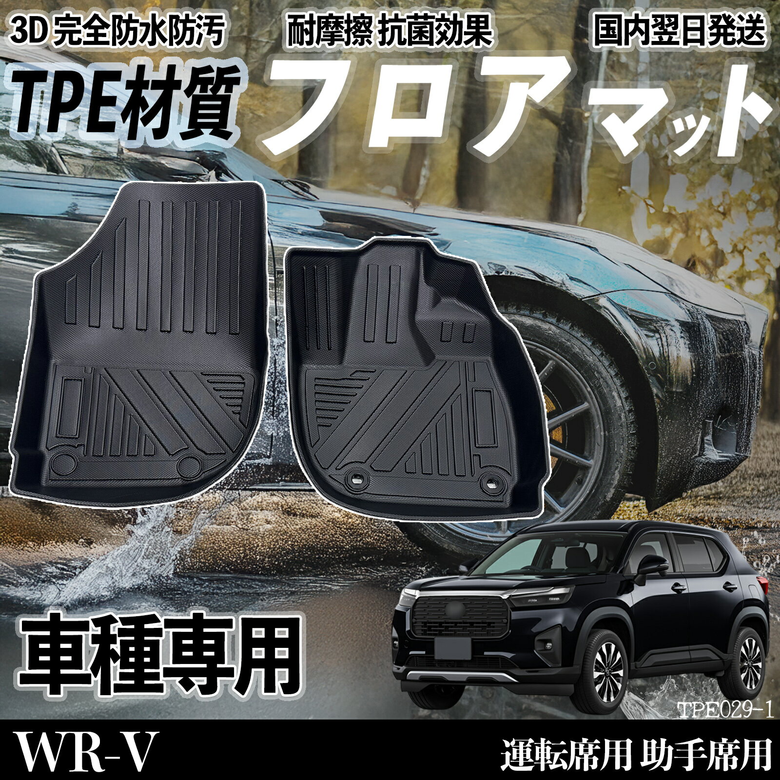 商品説明 適合車種 WR-V DG5 X Z Z+ R6.3- セット内容追加式 運転席用×1 助手席用×1 2列目用×1 ゲッジマット×1 商品の特徴 高品質TPE素材・オールシーズン対応 環境に優しい無臭TPE素材を使用。 耐摩耗・耐衝撃・耐熱性に優れ、夏も冬も変形しにくく、1年中快適。 お子様やペットがいても安心です。 3D立体構造・専用設計 車種専用3D設計で足元にぴったりフィット。 高いフチが泥・水を防ぎ、純正ストッパー対応でズレを防止します。 防水・滑り止め加工 滑り止め加工で走行中も安定。 防水性が高く、雨や雪の日も安心。 濡れ物や汚れから車内を守ります。 お手入れ簡単 汚れはサッと拭くだけ、水洗いも可能ですぐ乾く。 丈夫で長持ちします。 注意事項 ※ 【注意事項】ご購入前に、画像や適合表を見て、お車の年式・モデル・形が合っているかご確認ください。 折りたたんで梱包しているため、届いた直後に折り目がある場合があります。 平らに置く・重しを乗せる・ドライヤーで温めるなどの方法で簡単に元に戻せます。