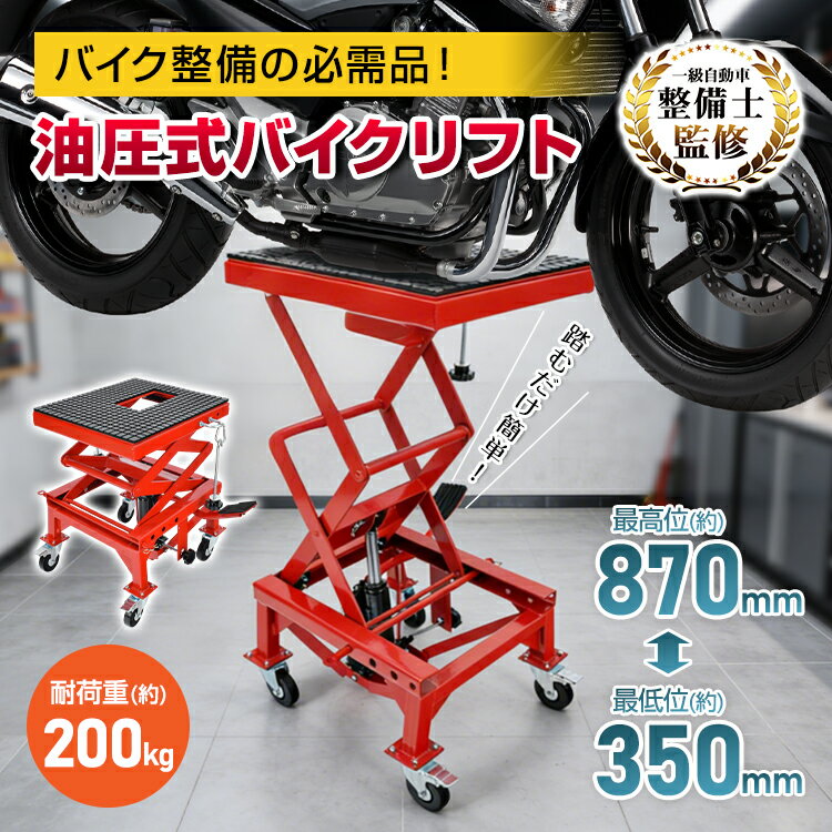 ■オートバイクのメンテナンスに最適なバイクリフト ■安心の耐荷重680kg ■足踏み式油圧で楽々ジャッキアップ ■5段階の下がり止めストッパーで安全 ■滑り止めとしても使える傷防止用ラバーシート ■キャスター付きで移動楽々 【商品内容】:バイクリフト 【サイズ】:(約)35.5cm×100cm×84cm 【重量】:(約)26kg 【耐荷重】:680kg 【材質】:鉄 【最高位】:375mm 【最低位】:115mm ○使用上の注意事項○ ※改造/本来の目的以外/強い衝撃などはお控え下さい。 ※仕様は入荷時期により予告なく変更する場合があります。 ※ディスプレイ画面等の環境上、写真と実際の商品の色とは多少違う場合がございます。 ※海外輸入商品により、汚れ/ダメージ等がついている場合がございます。 ○以上を了承の上、ご購入ください○ 39ショップ 送料無料 高評価 お買い物マラソン 買い回り ポイントアップ イーグルス感謝祭 ブラックフライデー 2025 タイムセール ブラックフライデーセール 楽天スーパーSALE クリスマスセール 年末年始セール 年末年始ギフト名称・内容 ・商品内容:バイクリフト 種類・サイズ ・サイズ:(約)35.5cm×100cm×84cm ・最高位:375mm ・最低位:115mm 重量・耐久 ・重量:(約)26kg ・耐荷重:680kg その他 ・材質:鉄 注意・説明 ※改造/本来の目的以外/強い衝撃などはお控え下さい。 ※仕様は入荷時期により予告なく変更する場合があります。 ※ディスプレイ画面等の環境上、写真と実際の商品の色とは多少違う場合がございます。 ※海外輸入商品により、汚れ/ダメージ等がついている場合がございます。 〇以上、ご同意の上、ご購入ください〇 *20%OFFクーポン⇒13,984円*【送料無料】バイクリフト 油圧式 バイクリフター 耐荷重680kg バイクジャッキ バイクスタンド 足踏みペダル式 最高位375mm 最低位115mm バイクリフトテーブル バイクリフトジャッキ 下がり止め 足踏み ジャッキアップ メンテナンススタンド ee349 17,480 ~