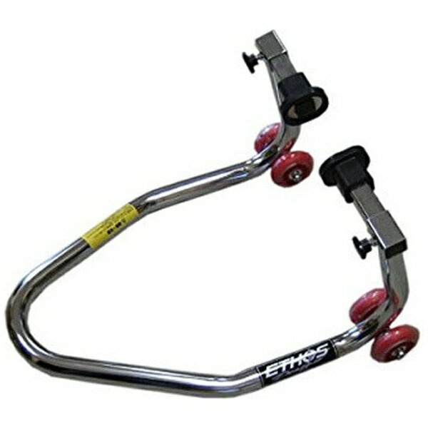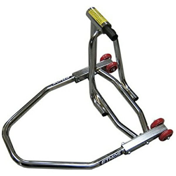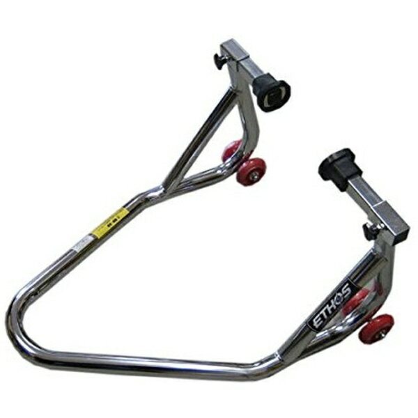 簡易型リアホイールメンテナンスツール!サイドスタンドと併用してリアホイールを持ち上げるための簡易型スタンド。 ホイールの清掃やチェーンメンテナンスなどの簡単なメンテナンスに最適です。 無段階で高さ調節が可能なため、様々なバイクに対応します。 ●調節範囲: 255mm〜370mm●本体中心穴: Φ10(ドライバーなどを差し込み、本体を回転させて高さの調節ができます。 )※この商品は、タイヤホイールやチェーンの洗浄などリア回りの簡易メンテナンスを行なうためのスタンドです。 スタンドの使用中は乗車やエンジンの始動はしないでください。 また、タイヤ交換などの重作業は行なわないでください※過度なリフトアップは転倒の恐れがあります。 リアタイヤが空転することを確認したら、それ以上リフトアップしないでください※作業は水平で滑りにくい地面で行なってください。 傾斜地や滑りやすい場所では転倒する恐れがあります※ハンドルをサイドスタンド側(左)に切り、フロントブレーキを掛けて使用してください。 車両が安定せず転倒する恐れがあります エトスデザイン|ETHOS フレームスタンド クロームメッキREDキュウキョクタイダウンツキ R72070R 47,300 ~