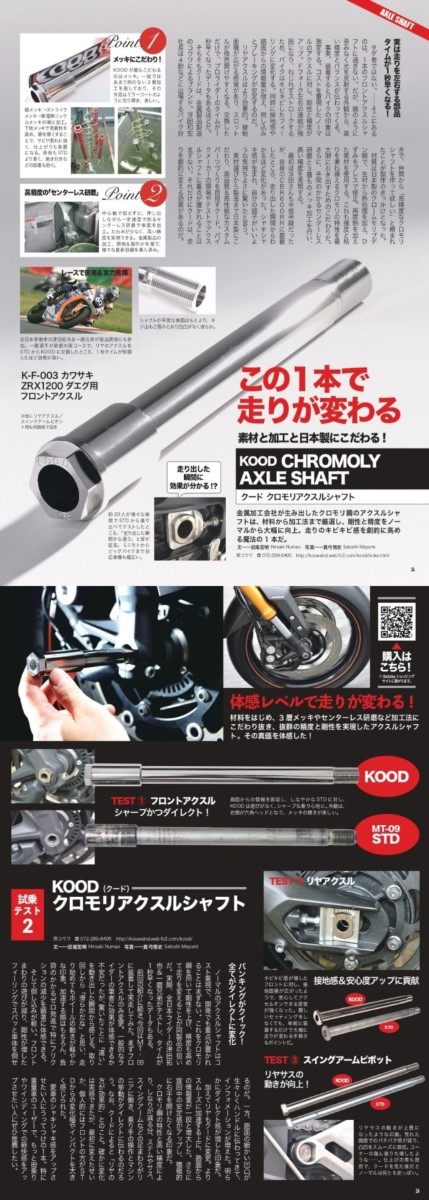 ■商品概要【素材/材質】クロモリ鋼材(3層メッキ仕上げ)メッキナット無し■詳細説明KOOD(クード)アクスルシャフトは素材の選択から製造まで『MadeinJAPAN』にこだわった高品質、高性能なカスタムパーツです。 材質は日本製のクロームモリブデン鋼で、生材から熱処理を加え、ひずみをプレスで修正。 再度熱を加えた素材を使用します。 これも強度と粘りを兼ね備えるクロモリの特性を最大限に引き出すためのこだわりなのです。 さらに、手間のかかるセンターレス研磨と3層ものメッキ加工を行い、高い精度を実現させました。 バイクメーカーの開発やテストでアクスルシャフトに重点が置かれることはまずありません。 それだけにクードアクスルシャフトは、走りを劇的に変える効果があるのです。 「KOOD」とは、素材選びから製造までMadeinJapanにこだわり、製造過程でも妥協を許さない工程を経て高品質・高性能なカスタムパーツを目指すブランドです。 シャフトそのものの強度を上げ、車体左右の連結剛性を高める事により、フロントフォークやスイングアームの動きがよりダイレクトに感じられ、路面からの情報がシャープに伝えられる事により、乗り味が大幅に向上します!!ミニバイク-BIGバイクまで、ノーマルシャフトと交換するだけで即座に体感できる。 その性能はまさに「魔法の棒」の異名を持っています!!拘りである作業工程や、素材にまで追求したMadeinJAPANの高いクオリティと、独自の三層メッキ加工の高い耐久性は、様々なお客様にオススメ出来る逸品です。 即効体感性能!!ぜひ貴方の愛車にも!!■素材製造で使う鋼材は国内メーカーより確かな品質を保証するミルシート(鋼材検査証明書)付きで仕入れています。 加工前には熱処理を加えています。 ■NC旋盤・マシニング・センタレス研磨様々な工程を駆使して形成していきます。 ■3層に渡るメッキ処理KOOD製品最大のこだわりである3層メッキ処理を施しております。 ここまで層を重ねたメッキ処理は一般ではあまり行われませんが、防錆や耐久性においての品質を高めるため3層メッキを採用しています。 ■注意点※メーカー都合により商品の仕様変更がある場合がございます。 ご了承ください。 ※適合車両であってもフロントフォーク等が純正以外などのカスタムされた車両の場合には適合致しません。 あらかじめご注意ください。 【取り付けについて】※アクスルシャフトは重要部品です。 取り付け作業はプロショップにおいて、必ず有資格者が行ってください。 ・シャフトのヘッド形状に合った、適正な工具を使用して作業を行ってください。 不適正な工具を使用して締め付けを行うと、シャフト表面に施しておりますメッキ被膜に傷が付き、錆の原因になります。 ・取り付け前に、シャフト表面へグリース等の油脂を散布してください。 シャフト表面には、KOODオリジナルの「3層メッキ被膜加工」を施しておりますので、通常使用ではシャフトそのものから錆は発生しません。 金属の電位差により発生する、ホイールベアリング等からの移り錆を防ぐためです。 ・締め付けトルクは、メーカー指定値を尊守してください。 ・純正ナットを使用して取り付ける車両におきましては、ナットをご確認ください。 転倒等で生じた傷や、セルフロック機能部分の摩耗がナットに見受けられた場合は必ず新品ナットを使用してください。 シャフトのネジ部損傷を防ぐためです。 【商品品質について】・製品管理におきましては万全の体制にて製作・管理しておりますが、万が一不具合がある場合は作業前にお問い合わせください。 ※いかなる場合も、取り付け(ホイールにシャフトを通す等の)作業後のクレーム及び返品には一切対応致しかねます。 ・錆につきましてKOOD製シャフトには「3層メッキ被膜加工」を施しております。 通常のメッキ被膜に比べ強固な被膜加工をしております。 使用状況により錆が発生する事もありますが、品質には問題ありません。 <錆が発生する主な原因>・「移り錆」 ... メッキ表面に外部からの錆が乗る・メッキ被膜の損傷 ... 誤った工具の使用・走行中の飛び石や転倒等※錆につきましては品質保証の対象外とさせていただきます。 予めご了承ください。 【ご注意】最近、KOODのシャフトでメッキナット付きなどでご購入された場合、「取り付けにてネジ山をかじる」などの案件を頂いております。 メッキの性質上で、メッキ同士(KOODシャフトとKOODナットなど)がかみ合う際、ネジ部のグリスレスの際に多く見られます。 お手数ですが、取り付けの際にネジ部分にはスレッジコンパウンドなどのかじり防止グリスをご使用下さい。 ※画像はイメージです。 ■適合車種R nineT Pure R nineT Pure 年式: 15-23  備考: K22R nineT Racer R nineT Racer 年式: 15-19  備考: K22R nineT Scrambler R nineT Scrambler 年式: 15-23  備考: K22R nineT Urban GS R nineT Urban GS 年式: 16-23  備考: K22R1200R R1200R  備考: K53R1250R R1250R 年式: 22-24  備考: K53 KOOD クード フ