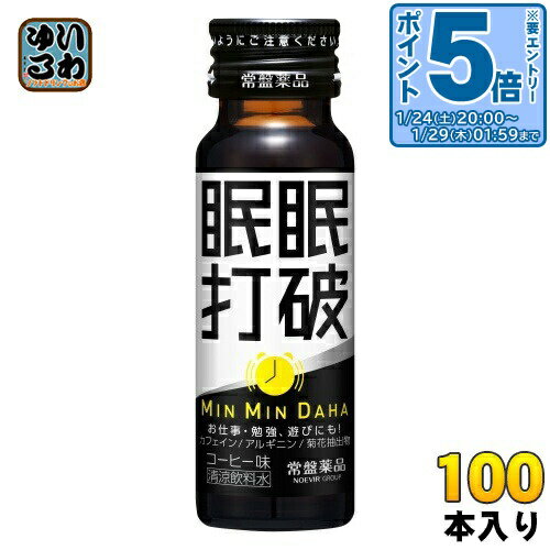 > こちらの商品の単品・まとめ買いはこちら【一個あたり 209円(税込)】【賞味期間】製造後24ヶ月【商品説明】朝の1ショットで、スマートに切り替え!キリっとビターな「コーヒー味」・1本でレギュラーコーヒー2杯分のカフェイン量!・菊花抽出物、アルギニン配合・こだわったコーヒー味で飲みやすい・50mLなので、1ショットで飲んでサッと次のアクションに移れる多量の飲用はさけて、1日1本を目安にお飲みください。 【名称および品名】清涼飲料水【エネルギー】1本(50ml)あたり25.7kcal【栄養成分】 たんぱく質 1.3g、脂質 0g、炭水化物 5.6g、食塩相当量 0.0185g【原材料】砂糖(国内製造)、コーヒー、ガラクトオリゴ糖液糖、難消化性デキストリン、菊花抽出物、サトウキビエキス末、ハーブエキス末/酸味料、アルギニン、カラメル色素、香料、カフェイン(抽出物)、ナイアシン、ビタミンC、ビタミンB1、ビタミンB6、ビタミンB2【保存方法】常温【製造者、販売者、又は輸入者】常盤薬品工業株式会社【変更事項】ページリニューアル日:2022/08/09変更内容:パッケージ※北海道・沖縄県・離島(一部)へのお届けは決済時に送料無料となっていても追加送料が必要です。 (コカ・コーラ直送を除く)北海道1個口 715円(税込)、沖縄県1個口 2420円(税込)※離島・一部地域は追加送料がかかる場合があります。 追加送料の詳細は注文確定メールにてご案内いたします。 ※本商品はご注文タイミングやご注文内容によっては、購入履歴からのご注文キャンセル、修正を受け付けることができない場合がございます。 変更・修正ができない場合は、メール、お電話にてご連絡をお願い致します。 ■ 法人・団体のお客様 大口購入のご相談承ります ■法人のお客様、各種団体のお客様で、まとまった数量でのご購入をご検討の際は、お気軽にご相談ください。 お客様のご要望に合わせて柔軟に対応させていただきます。 まずはお気軽にお問い合わせフォームよりご連絡ください。 送料無料 栄養ドリンク みんみんだは MIN MIN DAHA カフェイン アルギニン 菊花抽出物 コーヒー味 珈琲味 お仕事 勉強 遊び ケース まとめ買い セット 4987156813981 常盤薬品 眠眠打破 50ml 瓶 100本 (50本入×2 まとめ買い) 〔栄養ドリンク〕 20,844 ~
