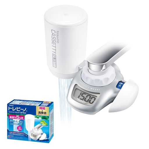 時短&高除去タイプシルバー/1500L/MK207SLX・Style:時短&高除去タイプPatternName:浄水器単品[カートリッジ1個]・パッケージ個数:1・生産国:日本、本体サイズ:高さ102×幅157×奥行100mm、本体重量:452g(満水時)・ろ材交換目安:5ヶ月、付属カートリッジ:MKC.SLX・長持ち 時短&高除去カートリッジ搭載!高級感のあるシルバーカラー・【大きく見やすいデジタルサイン】浄水の使用残量を1L単位(目安)で表示するので、カートリッジの交換時期を忘れず安心。 無駄なくカートリッジを交換できます。 【洗える吐水口キャップでいつでも清潔】水の出口である吐水口カバーを反時計回りに回すと簡単に取り外し可能。 外して洗えるので、いつでも清潔。 ・【極細原水シャワー】0.4mm径の極細シャワーで手あたりがやさしく、食器洗い時の水はねが少なくなります。 【30%節水】経済的でとってもエコ。 お皿洗いでも快適水量。 原水シャワーの穴を従来品より小さくする事でシャワーの強さを維持しています。 【水流】浄水(シャワー)、原水(ストレート)、原水(シャワー)■生産国:日本 ■サイズ:高さ102×幅157×奥行100mm / 本体重量:452g(満水時) ■素材:ポリアセタール、ABS樹脂 ■付属カートリッジ:MKC.SLX(カセッティシリーズ交換用カートリッジ・時短&高除去タイプ) ■ろ材の種類:活性炭、中空糸膜(ポリスルホン)、イオン交換体 ■ろ材交換時期の目安:5ヶ月(1日10L使用の場合)=1500L ■除去できる項目:JIS規格17項目【遊離残留塩素、濁り、総トリハロメタン、溶解性鉛、2-MIB(カビ臭)、CAT(農薬)、 テトラクロロエチレン、トリクロロエチレン、クロロホルム、ブロモジクロロメタン、ジブロモクロロメタン、ブロモホルム、 陰イオン界面活性剤、フェノール類、ジェオスミン、シス-1 2-ジクロロエチレン及びトランス-1 2-ジクロロエチレン、ベンゼン】 ■ろ過流量:3.0L/分 ■使用可能な最小動水圧:70kpa