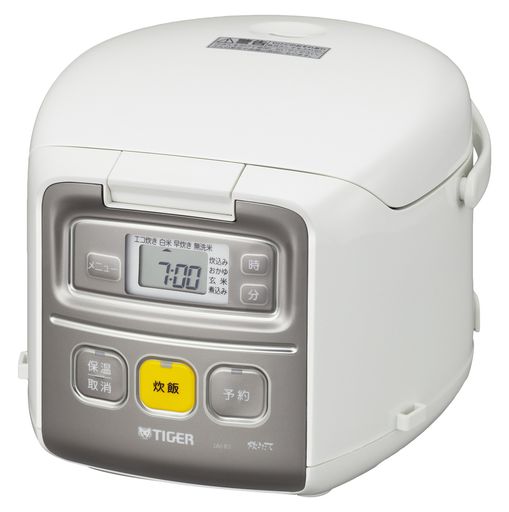 6.調理メニュー付/3合/ホワイト・ホワイト 3-3.5合 JAI-R551-W・・Style:6.調理メニュー付/3合/ホワイト・3合・煮込み料理もかんたんに「調理メニュー」・一人暮らしにおすすめ「3合炊き」・電気代約10%節約&約30%蒸気カット「エコ炊きメニュー」・ふっくらおいしいごはんが炊ける「黒遠赤釜採用」・本体サイズ:幅22.4×奥行28.3×高さ18.9cm ・素材・材質:本体・しゃもじ・計量カップ=ポリプロピレン、内なべ=アルミ ・電源:AC100V ・最大消費電力:350W ・保障期間:1年 ・しゃもじ、計量カップ、電源コード ・容量:3合炊き(0.09~0.54リットル) ・加熱方式:側面ヒーター、底ヒーター ・本体重量(kg):2.2・最大保温時間(白米):12時間 ・玄米コース:有 ・調理コース:有 煮込み ・蒸気を抑えた炊飯メニュー:有 エコ炊き シンプル機能の小容量3合炊きの炊飯ジャー 黒遠赤釜採用。 高い遠赤効果で炊きムラを抑え、ふっくらおいしいごはんを炊き上げます。 (なべ厚1.0mm) 炊飯方式マイコン方式 タイガー魔法瓶(TIGER) 炊飯器 3合 一人暮らし用 マイコン 調理メニュー付き 炊きたて ホワイト JAI-R551W 12,162 ~