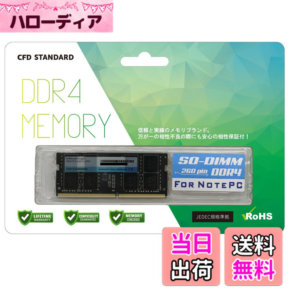 商品情報商品の説明【製品に関して】 日本で一番売れているメモリブランド*1 CFD販売からオリジナルメモリが登場! コストメリットの高いDRAMチップを厳選し、協力工場においても製造工程や工場出荷前でも厳しくチェック。 JEDECにも準拠し、品質・・サービスで安心しんしてお求め頂ける新シリーズ CFD Standardシリーズです。 【安心その1】 ご購入前にお使いのパソコン環境で対応するメモリがわからないといったご不安に関しましては、CFDメモリコンシェルジュサービスをご活用ください! お客様の環境に合うメモリをお調べさせて頂きます。 【安心その2】 ご購入後に発覚した相性トラブルによる動作不良・起動不良に関しては、ご購入から30日以内であれば返品いただけるCFD メモリ相性がございます。 【安心その3】 信頼性・品質に対し厳しいチェックにも耐えた証として、製品は永久をお付け致します。 主な仕様 【区分】ノートPC向け【規格】DDR4-3200 (PC4-25600)【容量】16GB (16GBx1枚)【特徴1】メモリ相性サービス【特徴2】永久対応