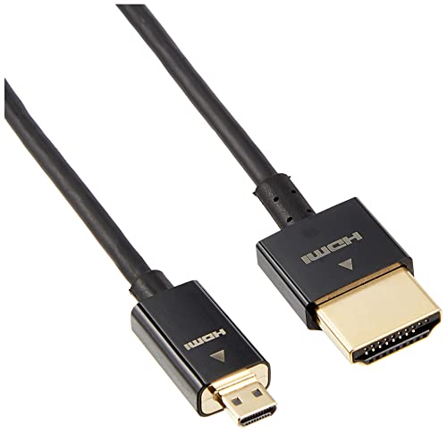 ケーブル直径約3.2mmで取り回しがしやすく、すっきり配線できる、スーパースリムタイプのイーサネット対応ハイスピードHDMIケーブルです。 HIGH SPEED with Ethernet認証済み製品です。 ハイビジョン対応の液晶テレビ、プラズマテレビ、プロジェクターなどのHDMI入力端子(Type A)付きの機器と、デジタルカメラ、スマートフォン、タブレットなどのHDMI-micro出力端子(Type D)を持つ機器を接続できます。 1本のケーブルで、映像信号と音声信号をデジタルのままで高速伝送するだけでなく、イーサネット信号の双方向通信を実現します。 100Mbpsのイーサネット通信を実現する、HEC(HDMIイーサネットチャンネル)に対応しています。 デジタル音声をテレビなどの表示機器からAVアンプなどの出力機器へ伝送できる、ARC(オーディオリターンチャンネル)に対応しています。 3DフルHD(1080p×2画面)、4K2K(4096×2160ドット)に対応しています。 色深度は従来の24bit(Full Color:フルカラー)から、30/36/48bit(Deep Color:ディープカラー)まで対応し、より豊かな色表現が可能です。 サビなどに強く信号劣化を抑える金メッキプラグを採用しています。 外部ノイズの干渉から信号を保護する3重シールドケーブルを採用しています。