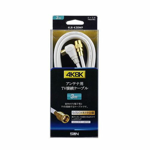 4K・8K放送を含むすべての放送電波に対応 ●アンテナ用TV接続ケーブル。 ●端子にさして90度ひねるだけでしっかりロック。 ●接触不良を低減する金メッキ仕上げ。 ●サン電子の4K8KラクラクケーブルLRをDCMでは販売しております。 その他のアンテナ・配線部材も多数取扱っております。 ●ケーブル長:3.0m。 ●L形プラグ-F形接栓。 ●仕様および外観・外装は予告なしに変更することがありますのでご了承ください。 ●製造には万全を期しておりますが、万一不具合のあった場合はお申し出ください。 それ以外の責はご容赦ください。