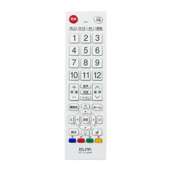 お店TOP>家電>別売部品>リモコン>リモコン(テレビ用)>エルパ(ELPA) テレビリモコン 汎用 ホワイト RC-TV102WH (1個)【エルパ(ELPA) テレビリモコン 汎用 ホワイト RC-TV102WHの商品詳細】●シンプル機能で使いやすい汎用テレビリモコン●主要メーカー25社に対応●コンパクトで握りやすいフォルム●オートサーチ機能搭載でメーカー設定が簡単●使わないボタンを無効化して誤操作を防止できる【発売元、製造元、輸入元又は販売元】朝日電器リニューアルに伴い、パッケージ・内容等予告なく変更する場合がございます。 予めご了承ください。 朝日電器574-8585 大阪府大東市新田旭町4-10072-871-1166広告文責:楽天グループ株式会社電話:050-5577-5043[生活家電] エルパ(ELPA) テレビリモコン 汎用 ホワイト RC-TV102WH(1個) 1,420 ~