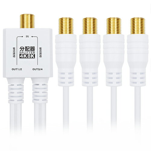 アンテナ分配器 OUT1M×2本 ケーブル付 白■入力周波数 : 10〜3224(MHz) ■ケーブル規格 : S-4C-FB ■コネクタ規格 : F型 ■コネクタ形状 : ネジ式-ネジ式 ■ケーブル直径 : 約6mm ■ケーブル長 : 出力側1m×2本 ■S-4C-FB規格同軸ケーブル2本付属 取り外し可能な、ネジ式ケーブルが2本付属しています。 コネクタはネジ式ですのでしっかりと機器に接続でき、抜け落ちる心配がありません。 ■信号の劣化を抑える金メッキコネクタケーブル ■複数の機器に信号を分けたいときに 1つのアンテナ信号を効率良く分配します。 本製品を使用することにより、レコーダーなどの周辺機器や、別室にあるテレビなど、2台の機器へ分配した信号を送ることが可能になります。 ■新4K8K衛星放送対応 従来の地デジ、BS、110度CS放送に加えて、最新の4K8K放送にも対応しています。 ■ノイズに強い亜鉛ダイキャストケース 亜鉛ダイキャストケースが外部からのノイズを防ぎます。 ■全端子BSアンテナ電源供給可能・本体寸法 : W約55mm×H約46.5mm×D約24mm ・本体重量 : 約150g ・カラー : ホワイト ・材質 : 亜鉛ダイキャスト ・インピーダンス : 75Ω ・付属品 : 同軸ケーブル2本付属 ・保証期間 : 1年間 ・生産国 : 中国【注意事項】■沖縄・離島は別途送料(税込1,000円)が掛かります。 ■お取り寄せ品のためメーカーに在庫がない場合がございます。 予めご了承ください。 ■お客様都合による返品は承っておりません。 予めご了承ください。