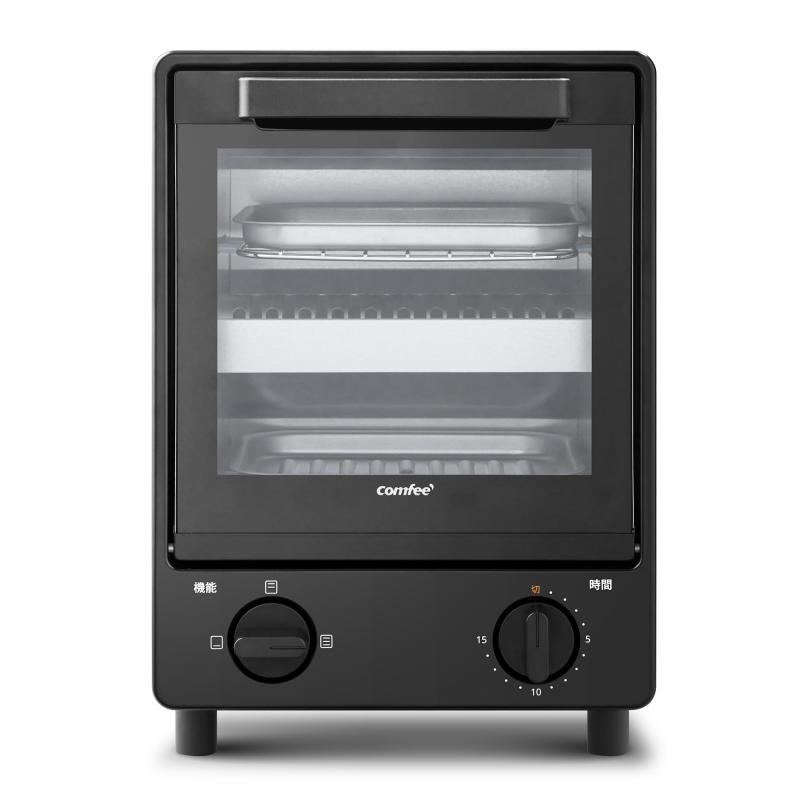 COMFEE' オーブントースター 縦型 上下2段構造 同時調理可能 3段階温度調節 15分タイマー 焼きムラ抑え スライドオープンドア CF-MF083-BK【縦型2段式で省スペース】横幅おおよそ25cmのコンパクトな縦型2段式設計で、狭いスペースでも置くことができます。 庫内容量が8Lで十分あり、2枚のトースト一気においしく焼きあげます。 【幅広い料理に対応】庫内が縦二段に分かれていて、上段と下段で別々のお料理が作れます。 食材によって、280W・720W・1000Wの三段階で出力調整が可能、グラタンなどの調理にも便利です。 【商品仕様】COMFEE' 縦型オーブントースター:コンパクトなサイズ:幅25.8x奥行き23.2x高さ33.3cm、約3kg 容量:8L、トースト2枚焼き 電源:AC100V 最大出力:1,000W タイマー:最大15分 機能:ピザ・トースト・切り餅・グラタン・バターロールなどの焼き料理加熱モード:上下中ヒーター・下ヒーター・上中ヒーター電源コード長さ:1m付属品:パンくずトレイ*1・受け皿*2・日本語取扱説明書 製品期間:一年間【ムラ少ない火力調整】トースター本体のヒーターは、上・中・下と3本あり、1段だけでも2段だけでも、つまみを回してヒーターを調整すれば、しっかりと熱を通し、均等加熱が可能です。 また最大15分のタイマーも付いて、焼き焦げを防ぎます。 【使い勝手も重視】本トースターはスライドオープンドア設計のため、ドアを開けるとたんに受け皿も引き出され、簡単に取り出します。 さらに、2枚の受皿と1枚のパンくずトレーも付属しており、普段のお手入れもラクになります。