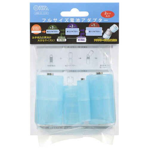 お手持ちの乾電池をアダプターに入れるだけでサイズを変えられます。 ●単1・単2・単3アダプター各2セット入り。 ●セット内容:単3形アダプター×2個、単2形アダプター×2個、単1形アダプター×2個。 ●単4→単3・本体サイズ:外周φ14.5×高さ50.5mm・質量:4g。 ●単3→単2・本体サイズ:外周φ24.5×高さ46mm・質量:10g。 ●単2→単1・本体サイズ:外周φ32×高さ62mm・質量:28g。 ●アダプタの組み合わせにより単2⇒単1、単3⇒単2、単3⇒単1、単4⇒単3、単4⇒単2、単4⇒単1にサイズ変更可能 ●本製品はサイズを補う商品であり、容量がアップするものではありません。 ●本製品はあくまでも、電池サイズが揃わないときに対応した緊急時の代用品なので、4個以上の同時使用や長時間の使用はしないでください。 ●機器によっては、本製品の電極が機器の端子に接触せず、使用できない場合があります。 ●2個以上一緒に使う場合、絶対に、新旧・異種類・他銘柄など性能が違う電池を混用しないでください。 ●充電式電池は本製品を取り付けたまま充電しないでください。
