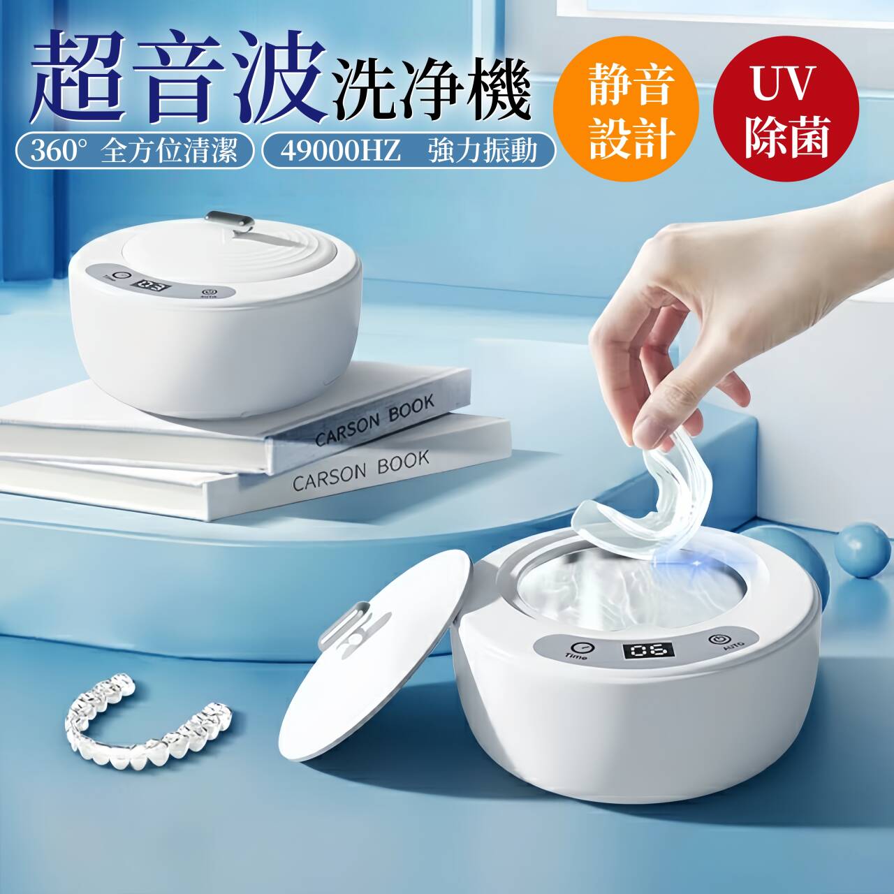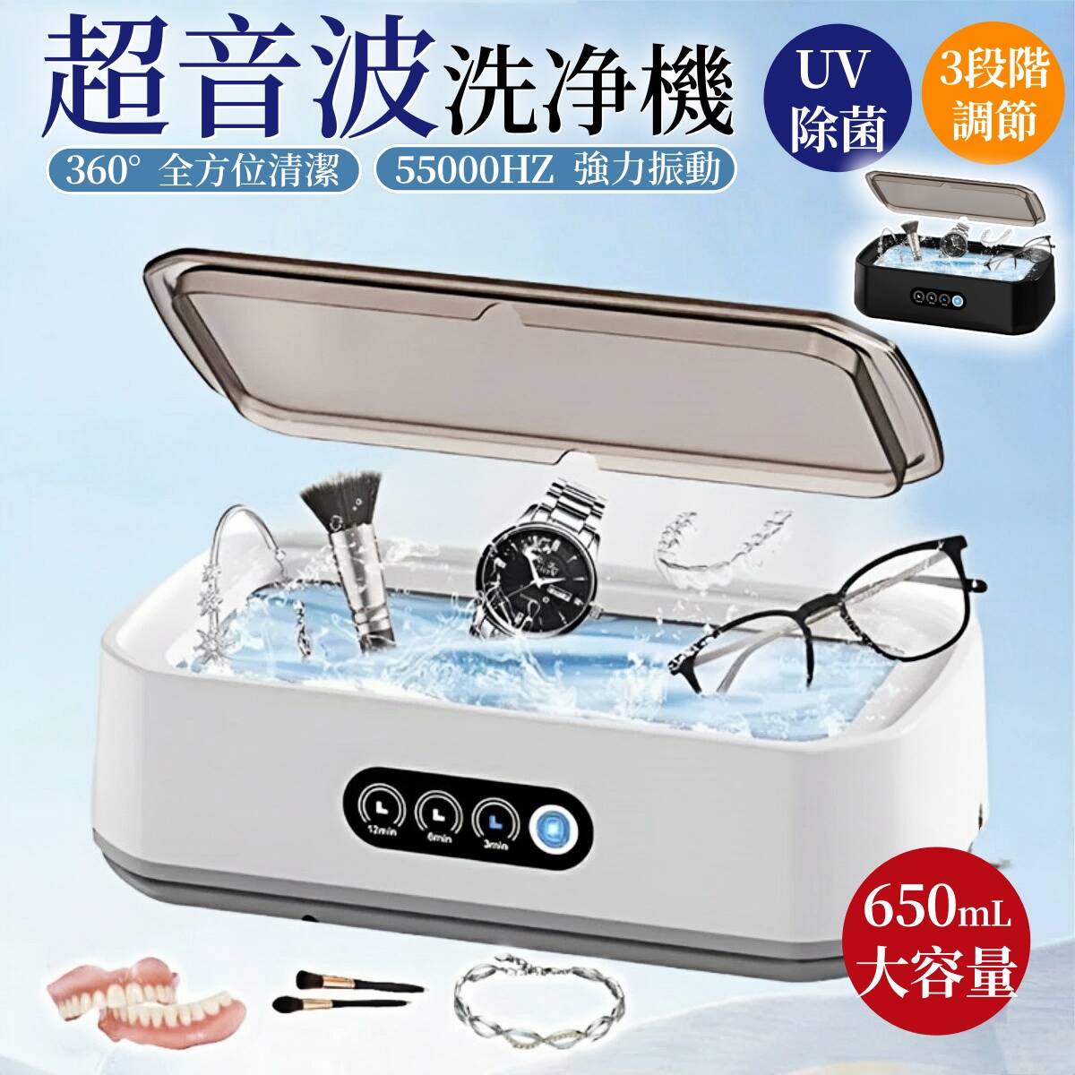 2025年最新モデル 超音波洗浄機 ? 毎日使える本格派クリーナー ? ○ 49kHzハイパワー超音波 + UV-LED殺菌 特殊周波数で生み出す微細な気泡が、普段の手洗いでは落とせない細かい汚れをしっかり除去。 UVライトで清潔を長時間キープ! ○ 便利な5段階タイマー搭載 3分(さっと洗い)?15分(しっかり洗い)まで、用途に合わせて自由設定。 忙しい朝も、夜のケアも思いのまま。 ○ 家族みんなで使えるマルチクリーナー ・ 矯正用マウスピース ・ 入れ歯ケース ・ 歯ブラシ(普通の歯ブラシ?電動歯ブラシヘッドまで) ・ 哺乳瓶の乳首 ・ アクセサリー など 使いやすさの秘密 1. 「完全防水設計(IPX6)」 → 水回りでも安心 2. 「衛生的な304ステンレス槽」 → 臭いが残りにくい 3. 「コンパクトボディ」 → 洗面所の狭いスペースにもすっきり収納 ○ セット内容 ・本体(幅12.3×奥行き12.3×高さ7cm) ・専用電源ケーブル ・クリーニングクロス ・取扱説明書 ○ 仕様 サイズ:幅12.3×奥行き12.3×高さ7cm 内部サイズ:直径8×高さ4cm 重量:約385g 素材:ABS+304ステンレス製 電源コード式 「毎日使うものだから、きちんと洗いたい」 → 気になる臭いやぬめりのない、さっぱりした使用感! 日本語の説明書はこちら 日本語の説明書はこちら 関連商品はこちら超音波洗浄機 入れ歯【UV-LED殺菌99.9%...\1300円クーポン利用で3580円/超音波... 超音波洗浄機 入れ歯【UV-LED殺菌99.9%】49000Hz+微細バブル 歯垢 強力洗浄 矯正マウスピース/入れ歯 洗浄機 コンパクト設計 5段階タイマー機能 IPX6防水 304ステンレス マウスピース・入れ歯・アクセサリー・歯ブラシに最適 小型 超音波洗浄機 4,880 ~