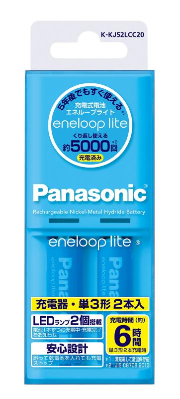 パナソニック エネループ 充電器セット 単3形充電池 2本付き エネループ lite(お手軽モデル) K-KJ52LCC20(充電池)リモコンなどの小電力機器に適し、くり返し回数を気にせず使える単3形エネループ「お手軽モデル BK-3LCC」の2本セット容量Min.950 mAh(スタンダードモデルの約半分)くり返し使用回数は約5000回(充電器)充電式エボルタ、エネループの両方の充電池に対応したお手軽なタイマー式「充電器 BQ-CC52」のセット単3・単4合わせて2本同時に充電可能充電LED表示2個付(6時間保護タイマーの動作状態を表示)(充電時間)●単3形×2本を約6時間で充電(同梱電池(BK-3LCC)充電時)●単4形×2本を約6時間で充電(別売お手軽モデル(BK-4LCC)充電時) パナソニック エネループ 充電器セット 単3形充電池 2本付き エネループ lite(お手軽モデル) K-KJ52LCC20 4,260 ~