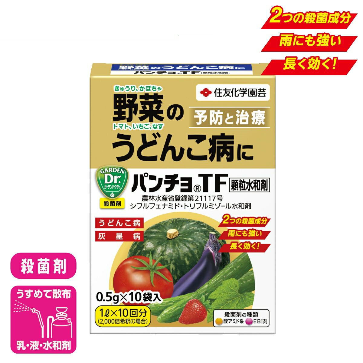 商品情報有効成分シフルフェナミド・トリフルミゾール容量0.5g×10袋入剤型水和剤商品特長 2つの殺菌成分で、きゅうり、かぼちゃ、トマト、いちご、なすなどのうどんこ病にすぐれた予防効果と治療効果があります。 既存剤に耐性をもったうどんこ病にも有効です。 浸達性があり、雨にも強く、効きめは長く続きます。 使用方法 水に溶かして散布適用病害と使用方法 ※印は収穫物への残留回避のため、その日まで使用できる収穫前の日数と、本剤及びそれぞれの有効成分を含む農薬の総使用回数の制限を示す。 作物名適用病害名希釈倍数使用液量使用時期※総使用回数※本剤シフルフェナミドトリフルミゾールきゅうり、トマト、ミニトマト、いちご、なす、すいか、メロン、ピーマン、うり類(漬物用)うどんこ病2,000倍100〜300L/10a収穫前日まで2回2回5回かぼちゃ5回(種子粉衣は1回)にがうり3回ズッキーニ4,000倍4回りんご2,000倍200〜700L/10a収穫7日前まで3回おうとう灰星病収穫14日前まで2回麦類うどんこ病60〜150L/10a3回(種子粉衣は1回)花き類・観葉植物100〜300L/10a-5回5回まさき、さるすべり2回2回 使用方法:散布 効果・薬害等の注意 1.うり類の幼苗期には、濃緑化症状および生育抑制が生ずることがあるので使用しないでください。 2.過度の連用は避け、なるべく作用性の異なる薬剤との輪番で使用してください(薬剤耐性菌出現回避)。 3.本剤は顆粒がかたまりになって溶けにくくなる場合があるので薬液調製の際はよく攪拌してください。 かたまった本剤を希釈して使用しても品質及び効果に問題ありません。 4.適用作物群に属する作物又はその新品種に使用する場合は、使用者の責任において事前に薬害の有無を十分確認してください。 使用方法等を厳守してください。 特に初めて使用する場合は、病害虫防除所または販売店と相談することが望ましいです。 安全使用上の注意 1.体調のすぐれない時は散布しないでください。 2.眼に入らないように注意。 眼に入った場合は、直ちに水洗し、眼科医の手当を受けてください(刺激性)。 使用後は洗眼してください。 3.かぶれやすい人は取扱いに十分注意してください。 4.桑葉にかからないように注意してください(蚕毒)。 5.散布中や、散布当日は散布区域に小児やペットが立ち入らないように配慮してください。 6.使用後の空袋は良くたたいて中身を完全に出してから処理してください。 検索キーワード家庭菜園 ガーデニング 園芸 殺菌 野菜パンチョTF顆粒水和剤 0.5g×10袋入 住友化学園芸 野菜のうどんこ病に! 2 殺菌剤 野菜 パンチョTF顆粒水和剤 0.5g×10袋入 住友化学園芸 うどんこ病 家庭菜園 園芸 1,250 ~