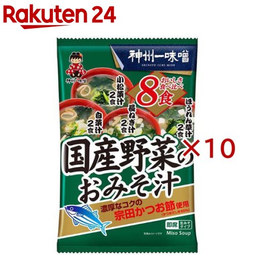 お店TOP>フード>加工食品・惣菜>インスタント食品>インスタント味噌汁(即席味噌汁)>国産野菜のおみそ汁 (8食入×10セット)【国産野菜のおみそ汁の商品詳細】●野菜はすべて国産を使用しています。 (小松菜・長ねぎ・白菜・ほうれん草)●濃厚なコクの宗田かつお節を使いました。 (かつおだし中60%)●調味みそには、伝統の発酵技術を活かした、旨みの際立つみそを使用。 さらに6種類のだしを使って、おいしく仕上げました。 【セット詳細】小松菜汁/17.0g×2食、長ねぎ汁/16.8g×2食、白菜汁/16.7g×2食、ほうれん草汁/16.6g×2食 計4種8食【品名・名称】即席みそ汁(生みそタイプ)【国産野菜のおみそ汁の原材料】調味みそ:米みそ(国内製造)、食塩、砂糖、かつおエキス、宗田かつお節粉末、昆布エキス、煮干粉末、焼きあご粉末、あじ煮干粉末/酒精、調味料(アミノ酸等)、(一部に大豆を含む)★小松菜汁の具:小松菜、ふ、わかめ、だし顆粒(食塩、ぶどう糖、宗田かつお節粉末、デキストリン)/調味料(アミノ酸等)、酸化防止剤(ビタミンE)、クエン酸、(一部に小麦・乳成分を含む)★長ねぎ汁の具:長ねぎ、油あげ、わかめ、だし顆粒(食塩、ぶどう糖、宗田かつお節粉末、デキストリン)/調味料(アミノ酸等)、凝固剤、酸化防止剤(ビタミンE)、(一部に乳成分・大豆を含む)★白菜汁の具:白菜、ふ、わかめ、だし顆粒(食塩、ぶどう糖、宗田かつお節粉末、デキストリン)/調味料(アミノ酸等)、酸化防止剤(ビタミンE)、クエン酸、(一部に小麦・乳成分を含む)★ほうれん草汁の具:ほうれん草、とうふ、わかめ、だし顆粒(食塩、ぶどう糖、宗田かつお節粉末、デキストリン)/調味料(アミノ酸等)、豆腐用凝固剤、(一部に乳成分・大豆を含む)【栄養成分】★小松菜汁 1食(17.0g)あたりエネルギー:26kcal、たんぱく質:1.8g、脂質:0.8g、炭水化物:2.9g、食塩相当量:1.9g★長ねぎ汁 1食(16.8g)あたりエネルギー:26kcal、たんぱく質:1.8g、脂質:0.9g、炭水化物:2.6g、食塩相当量:1.9g★白菜汁 1食(16.7g)あたりエネルギー:24kcal、たんぱく質:1.7g、脂質:0.7g、炭水化物:2.8g、食塩相当量:1.9g★ほうれん草汁 1食(16.6g)あたりエネルギー:24kcal、たんぱく質:1.8g、脂質:0.8g、炭水化物:2.5g、食塩相当量:1.8g【アレルギー物質】小麦、乳成分、大豆【保存方法】高温の場所を避け、保存してください【発売元、製造元、輸入元又は販売元】神州一味噌※説明文は単品の内容です。 リニューアルに伴い、パッケージ・内容等予告なく変更する場合がございます。 予めご了承ください。 ・単品JAN:4902703031823神州一味噌112-0012 東京都文京区大塚3-5-10 住友成泉小石川ビルディング本館2階0120-550553広告文責:楽天グループ株式会社電話:050-5577-5043[スープ] 国産野菜のおみそ汁(8食入×10セット) 3,022 ~