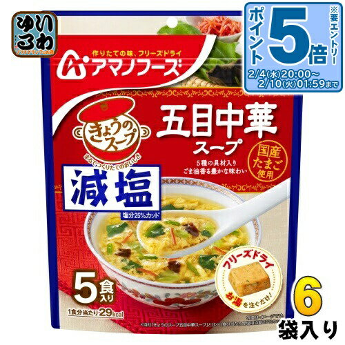 > こちらの商品の単品・まとめ買いはこちら【一個あたり 519円(税込)】【賞味期間】製造後1年【商品説明】当社「きょうのスープ 五目中華スープ」と比べ、1食当たり食塩相当量25%カット。 5種の具材が入ったごま油香る風味豊かな中華スープです。 コクと風味がひろがる味わいに仕上げました。 【内容量(1袋)】36.5g(7.3g×5食)【名称および品名】即席みそ汁(乾燥タイプ)【エネルギー】1食分(7.3g)あたり29kcal【栄養成分】たんぱく質 1.3g、脂質 0.92g、炭水化物 4.0g、食塩相当量 0.93g【原材料】デキストリン、還元水あめ、しょうゆ、ガラスープパウダー、でん粉、食塩、ごま油、かにエキス、チキンエキス、オイスターエキス、ジンジャーペースト、醸造酢、砂糖、酵母エキスパウダー、たんぱく加水分解物、香辛料、具(液全卵(国内製造)、ほうれんそう、キャベツ、魚肉練り製品、乾燥きくらげ)/調味料(アミノ酸等)、増粘剤(タマリンドガム)、セルロース、着色料(紅麹、カラメル、アナトー)、酸化防止剤(ビタミンE)、(一部にかに・小麦・卵・乳成分・ごま・大豆・鶏肉・豚肉を含む)【保存方法】常温【製造者、販売者、又は輸入者】アサヒグループ食品株式会社【アレルギー特定原材料】卵、乳、小麦、かに、ごま、大豆、鶏肉、豚肉※北海道・沖縄県・離島(一部)へのお届けは決済時に送料無料となっていても追加送料が必要です。 (コカ・コーラ直送を除く)北海道1個口 715円(税込)、沖縄県1個口 2420円(税込)※離島・一部地域は追加送料がかかる場合があります。 追加送料の詳細は注文確定メールにてご案内いたします。 ※本商品はご注文タイミングやご注文内容によっては、購入履歴からのご注文キャンセル、修正を受け付けることができない場合がございます。 変更・修正ができない場合は、メール、お電話にてご連絡をお願い致します。 ■ 法人・団体のお客様 大口購入のご相談承ります ■法人のお客様、各種団体のお客様で、まとまった数量でのご購入をご検討の際は、お気軽にご相談ください。 お客様のご要望に合わせて柔軟に対応させていただきます。 まずはお気軽にお問い合わせフォームよりご連絡ください。 送料無料 スープ FD インスタント 即席 手軽 簡単 便利 即席 汁もの 楽らく 美味しい インスタントスープ 即席スープ 乾燥スープ 凍結乾燥 お湯 注ぐだけ 一人暮らし 今日のスープ 天野実業 天野実業株式会社 個包装 個別包装 5食入り 塩分控えめ 塩分ひかえめ げんえん 塩分少なめ 中華スープ 五目スープ 4971334208843 〔エントリーでポイント5倍!〕 アマノフーズ フリーズドライ 減塩きょうのスープ 五目中華スープ 5食 6袋 (1袋入×6 まとめ買い) スープ FD インスタント 即席 個包装 3,110 ~