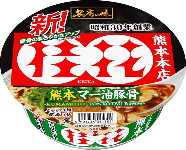 ※他店舗と在庫併用の為、品切れの場合は、ご容赦ください。 商品紹介『名店の味』シリーズをリニューアルいたします。 本格的な味わいを追求すべく、あとひく豚骨のまろやかさを強化し、マー油の香ばしい風味とコクが特徴の豚骨ラーメンに仕上げました。 原材料・成分めん(小麦粉(国内製造)、でん粉、植物油脂、食塩、大豆食物繊維)、スープ(ポークエキス、デキストリン、食塩、豚脂、糖類、たん白加水分解物、調味油脂、植物油脂、ガーリックペースト、チキン調味料、酵母エキス)、かやく(チャーシュー、茎わかめ、ねぎ、にんにく加工品)/加工でん粉、調味料(アミノ酸等)、増粘剤(加工でん粉、キサンタン)、酒精、乳化剤、カラメル色素、香料、かんすい、酸化防止剤(ビタミンE)、クチナシ色素、カカオ色素、香辛料抽出物、(一部に小麦・卵・乳成分・ごま・大豆・鶏肉・豚肉を含む)【特徴】・原材料名:めん(小麦粉(国内製造)、でん粉、植物油脂、食塩、大豆食物繊維)、スープ(ポークエキス、デキストリン、食塩、豚脂、糖類、たん白加水分解物、調味油脂、植物油脂、ガーリックペースト、チキン調味料、酵母エキス)、かやく(チャーシュー、茎わかめ、ねぎ、にんにく加工品)/加工でん粉、調味料(アミノ酸等)、増粘剤(加工でん粉、キサンタン)、酒精、乳化剤、カラメル色素、香料、かんすい、酸化防止剤(ビタミンE)、クチナシ色素、カカオ色素、香辛料抽出物、(一部に小麦・卵・乳成分・ごま・大豆・鶏肉・豚肉を含む)・アレルゲン情報:小麦・卵・乳成分・ごま・大豆・鶏肉・豚肉・栄養成分:熱量 454kcal、たんぱく質 11.3g、脂質 13.9g、炭水化物 70.9g、食塩相当量 7.8g(めん・かやく 2.0g、スープ 5.8g)※商品仕様はメーカー都合などにより変更になる場合がございます。 最新情報は個別にご確認ください。 ※他店舗と在庫併用の為、品切れの場合は、ご容赦ください。 商品紹介『名店の味』シリーズをリニューアルいたします。 本格的な味わいを追求すべく、あとひく豚骨のまろやかさを強化し、マー油の香ばしい風味とコクが特徴の豚骨ラーメンに仕上げました。 原材料・成分めん(小麦粉(国内製造)、でん粉、植物油脂、食塩、大豆食物繊維)、スープ(ポークエキス、デキストリン、食塩、豚脂、糖類、たん白加水分解物、調味油脂、植物油脂、ガーリックペースト、チキン調味料、酵母エキス)、かやく(チャーシュー、茎わかめ、ねぎ、にんにく加工品)/加工でん粉、調味料(アミノ酸等)、増粘剤(加工でん粉、キサンタン)、酒精、乳化剤、カラメル色素、香料、かんすい、酸化防止剤(ビタミンE)、クチナシ色素、カカオ色素、香辛料抽出物、(一部に小麦・卵・乳成分・ごま・大豆・鶏肉・豚肉を含む)【特徴】・原材料名:めん(小麦粉(国内製造)、でん粉、植物油脂、食塩、大豆食物繊維)、スープ(ポークエキス、デキストリン、食塩、豚脂、糖類、たん白加水分解物、調味油脂、植物油脂、ガーリックペースト、チキン調味料、酵母エキス)、かやく(チャーシュー、茎わかめ、ねぎ、にんにく加工品)/加工でん粉、調味料(アミノ酸等)、増粘剤(加工でん粉、キサンタン)、酒精、乳化剤、カラメル色素、香料、かんすい、酸化防止剤(ビタミンE)、クチナシ色素、カカオ色素、香辛料抽出物、(一部に小麦・卵・乳成分・ごま・大豆・鶏肉・豚肉を含む)・アレルゲン情報:小麦・卵・乳成分・ごま・大豆・鶏肉・豚肉・栄養成分:熱量 454kcal、たんぱく質 11.3g、脂質 13.9g、炭水化物 70.9g、食塩相当量 7.8g(めん・かやく 2.0g、スープ 5.8g)※商品仕様はメーカー都合などにより変更になる場合がございます。 最新情報は個別にご確認ください。