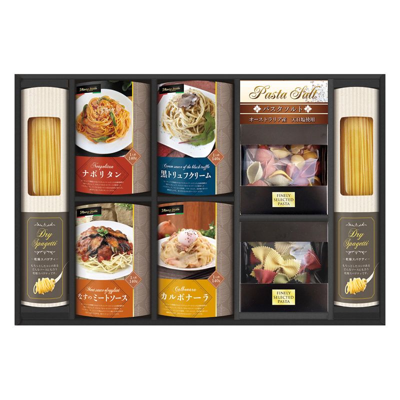 ギフトサービスについて『世界パスタコンクール』で3大会連続優勝のマルコシェフが監修したパスタソースが入ったパスタセットです。 温めたパスタソースをスパゲティにかけて本格的な味わいが楽しめます。 ■メーカー:BUONO TAVOLA■商品名:世界チャンピオンマルコのパスタソース パスタバラエティセット■セット内容:セット内容/スパゲティ(130g)×3、パスタソース(ナポリタン・黒トリュフのクリームソース・茄子のミートソース・カルボナーラ)(各140g)・自然色パスタ(コンキリエ)(60g)・自然色パスタ(ファルファーレ)(40g)・パスタソルト(50g)・エクストラバージンオリーブオイル(100g)×各1■箱サイズ:32.5×58×5.5cm■賞味期限:常温1年■アレルゲン:卵・乳・小麦■品番:HRRK-50■のし:大杉■JANコード:4580386255134商品特徴一覧2026年 贈りもの・お返しものギフト、【多用途ギフト[パーソナルギフト 2026] → ご予算別セレクション → 定価5、000円(税別)前後 → 食品】、[B2]、2025年、令和7年、ギフト、贈り物、内祝い、プレゼント、お返し、4580386255134、通信販売、通販、販売、買う、購入、お店、売っている、ショッピング▼関連商品はこちら。 BUONO TAVOLA 銘牛カレー&ホワイトシチューセット (HRWC-50)2026年 贈りもの・お返しものギフト【BUONO TAVOLA 世界チャンピオンマルコのパスタソース パスタバラエティセット (HRRK-50)】広告文責(有)イースクエアTEL:0120-532-772『世界パスタコンクール』で3大会連続優勝のマルコシェフが監修したパスタソースが入ったパスタセットです。 温めたパスタソースをスパゲティにかけて本格的な味わいが楽しめます。 ■メーカー:BUONO TAVOLA■商品名:世界チャンピオンマルコのパスタソース パスタバラエティセット■セット内容:セット内容/スパゲティ(130g)×3、パスタソース(ナポリタン・黒トリュフのクリームソース・茄子のミートソース・カルボナーラ)(各140g)・自然色パスタ(コンキリエ)(60g)・自然色パスタ(ファルファーレ)(40g)・パスタソルト(50g)・エクストラバージンオリーブオイル(100g)×各1■箱サイズ:32.5×58×5.5cm■賞味期限:常温1年■アレルゲン:卵・乳・小麦■品番:HRRK-50■のし:大杉■JANコード:4580386255134※お客さま都合による、ご注文後の[キャンセル][変更][返品][交換]はお受けできませんのでご注意下さいませ。 ※当店では、すべての商品で在庫を持っておりません。 記載の納期を必ずご確認ください。 ※ご注文いただいた場合でもメーカーの[在庫切れ][欠品][廃盤]などの理由で、[記載の納期より発送が遅れる][発送できない]場合がございます。 その際は、当店よりご連絡させていただきます。 あらかじめご了承ください。 ※リニューアル等により パッケージ、仕様、セット内容 が変更になる場合がございます。 予めご了承下さい。 こちらの商品は【お取り寄せ(5〜7営業日以内に発送予定)】となります。 あらかじめご了承くださいませ。