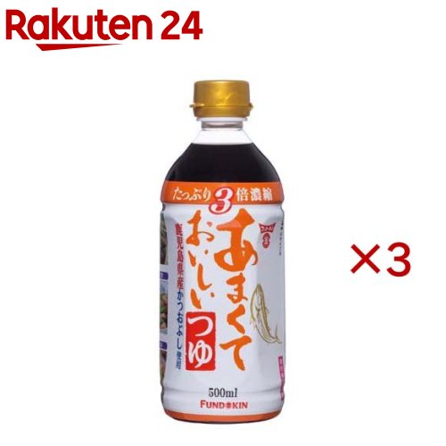 ◆商品名:フンドーキン?油 あまくておいしいそばつゆ 300ml×3本 原材料:しょうゆ(小麦を含む、国内製造)、砂糖、砂糖混合ぶどう糖果糖液糖、たんぱく加水分解物、発酵調味料、食塩、かつおエキス、かつお節(粗砕)、かつお節エキス、混合削り節、醸造酢、昆布エキス/調味料(アミノ酸等)、アルコール、甘味料(甘草)、酸味料 商品サイズ(高さx奥行x幅):16.2cm×6.5cm×13cm 4902581024894 商品紹介 鹿児島県産かつお節と混合削り節(さば節・ムロ節・かつお節)からだしを自社抽出。 だしの風味とほどよい甘みの九州嗜好のそばつゆです。 そばつゆらしく後味すっきりに仕上げました。 お得に使える3倍濃縮。 ざるそば、かけそばなどだけでなく、希釈して丼ぶりや煮物などの料理にもご使用いただけます。 原材料・成分 しょうゆ(小麦を含む、国内製造)、砂糖、砂糖混合ぶどう糖果糖液糖、たんぱく加水分解物、発酵調味料、食塩、かつおエキス、かつお節(粗砕)、かつお節エキス、混合削り節、醸造酢、昆布エキス/調味料(アミノ酸等)、アルコール、甘味料(甘草)、酸味料 フンドーキン?油 あまくておいしいそばつゆ 300ml×3本 1,987 ~
