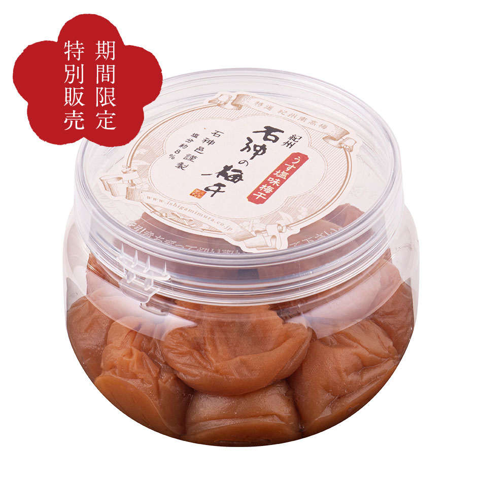 豊作祈願セール 3月6日(金)23:59まで まとめ買いがお得です。 3個以上買うと100円引きクーポンはこちら↓ ※こちらのクーポンの使用は豊作祈願セールの商品に限ります。 \1個から注文可能なご家庭用パック!/ これまでもその便利さでお客様からご好評をいただておりました「ご家庭用パック」。 今回は期間限定ではございますがさらに便利に、1パックからのご注文が可能になりました! 一番人気の石神邑を代表する梅干「うす塩味梅干」南高梅の美味しさを十分に味わえる、減塩仕上げの梅干です。 商品説明 名称 調味梅干 原材料名 梅、漬け原材料名 〔糖類(砂糖、果糖ぶどう糖液糖)、食塩、みりん、醸造酢、はちみつ〕 酒精、調味料(アミノ酸等)、V.B1、酸味料、野菜色素 原料原産地名 紀州産 内容量270g(約14粒)※粒数が多少前後する場合がございます。 賞味期限6カ月 保存方法直射日光を避け、常温で保存してください。 塩分 約8% 製造者株式会社 濱田和歌山県田辺市上芳養391番地 豊作祈願セール おすすめ3種の梅干 しそ漬梅干 うす塩味梅干 はちみつ梅干 領収書に関しまして 楽天会員様、非会員様共に、購入履歴詳細から領収書をPDFにて発行できます。 会員様は購入履歴詳細から、 非会員様はこちらより購入履歴が確認でき、領収書の発行が可能です。 ※代金引換、後払い決済については購入履歴から領収書の発行はできません。 様々なギフト・シーンにご利用いただけます。 季節のご挨拶として お正月 お年賀 お年始 新年のご挨拶 お彼岸 ひな祭り 端午の節句 こどもの日 母の日 父の日 御中元 お中元 お盆 初盆 残暑御見舞 残暑見舞い 敬老の日 寒中見舞 お歳暮 御歳暮 クリスマス クリスマスプレゼント 春夏秋冬 様々な祝い事に 誕生日 バースデー プレゼント 七五三御祝 初節句御祝 節句 幼稚園 入園内祝い 御入園御祝 小学校 中学校 高校 大学 合格祝い 進学内祝い 入学祝い 入学内祝い 卒業記念品 卒業祝い 成人式 御成人の御祝い 就職祝い 社会人 昇進祝い 昇格祝い 就任祝い 御結婚お祝い ご結婚御祝い 結婚祝い 結婚内祝い 結婚式 引き出物 引出物 御出産御祝 ご出産御祝い 出産御祝 出産祝い 出産内祝い お宮参り御祝 金婚式御祝 銀婚式御祝 御新築祝 新築御祝 新築内祝い 長寿のお祝いに 61歳 還暦(かんれき) 還暦御祝い 還暦祝い 祝還暦 華甲(かこう) 70歳 古希(こき)古希御祝 77歳 喜寿(きじゅ)喜寿御祝 80歳 傘寿(さんじゅ) 傘寿御祝 88歳 米寿(べいじゅ)米寿御祝 90歳 卒寿(そつじゅ)卒寿御祝 99歳 白寿(はくじゅ) 白寿御祝 100歳 百寿(ひゃくじゅ・ももじゅ) 祝百寿 寿 寿福 祝御長寿 弔事用ギフト 御供 お供え物 粗供養 御仏前 御佛前 御霊前 香典返し 法要 法事 仏事 法事引き出物 法要引き出物 年回忌法要 一周忌 三回忌 七回忌 十三回忌 十七回忌 二十三回忌 二十七回忌 御膳料 御布施 法人様向け 開店祝い 御開店祝 御開業祝 開院祝い 周年記念 来客 お茶請け 異動 転勤 退職 退職祝い 挨拶回り 転職 お餞別 贈答品 粗品 心ばかり 寸志 新歓 歓迎 送迎 新年会 忘年会 二次会 記念品 景品 プチギフトとして お土産 ゴールデンウィーク(GW) 帰省土産 手土産 バレンタインデー ホワイトデー お花見 お世話になりました ありがとう ごめんね おめでとう お返しの品として 御礼 お礼 謝礼 御返し お返し お祝い返し 御見舞御礼 など こんな方にお送りいただけます お父さん お母さん 兄弟 姉妹 子供さん お孫さん おばあちゃん おじいちゃん 奥さん 彼女 旦那さん 彼氏 先生 職場 先輩 後輩 同僚 取引先 など 豊作祈願まとめ買いセール 期間限定販売【紀州南高梅】うす塩味梅干[塩分8%] 家庭用ペット容器270g(約14粒)梅干し 梅干 紀州南高梅 石神邑 石神 南高梅 うめぼし 1,600 ~