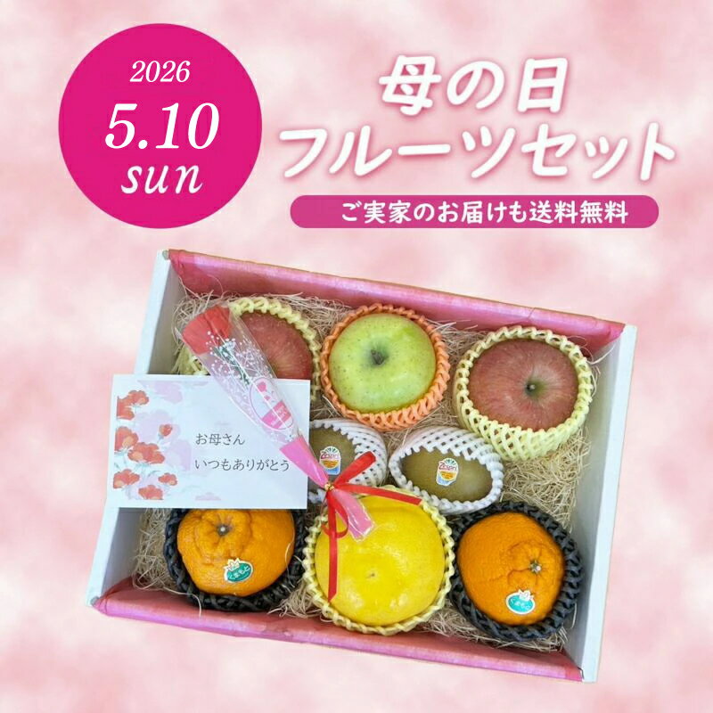 ≪2026年母の日限定ギフト≫ 毎年、大好評のフルーツ詰め合わせ。 贈り物にも大変喜ばれています! 母の日限定のフルーツの贈り物。 熊本を代表するデコポンの他、ジューシーオレンジやりんご、 ゴールドキウイをきれいに箱詰めしてお届け致します。 彩り鮮やかなフルーツセットが、特別な日を彩ります。 母の日用のメッセージカードおよびカーネーション(造花)も一緒にお入れしてお届けします! お届けは5月2日?5月10日の間でお届けさせていただきます。 ※お届け日はご指定いただけませんので、ご了承くださいませ。 □■□お届け内容について□■□ 【商品名】 2026年母の日ギフト限定 フルーツセット 【内容量】 赤りんご2玉、青りんご1玉、サンゴールドキウイ2玉、デコポン2玉、ジューシーオレンジ1玉 母の日 ギフト 2026 フルーツセット(赤りんご2玉、青りんご1玉、ゴールドキウイ2玉、デコポン2玉、ジューシーオレンジ1玉) 5,980 ~